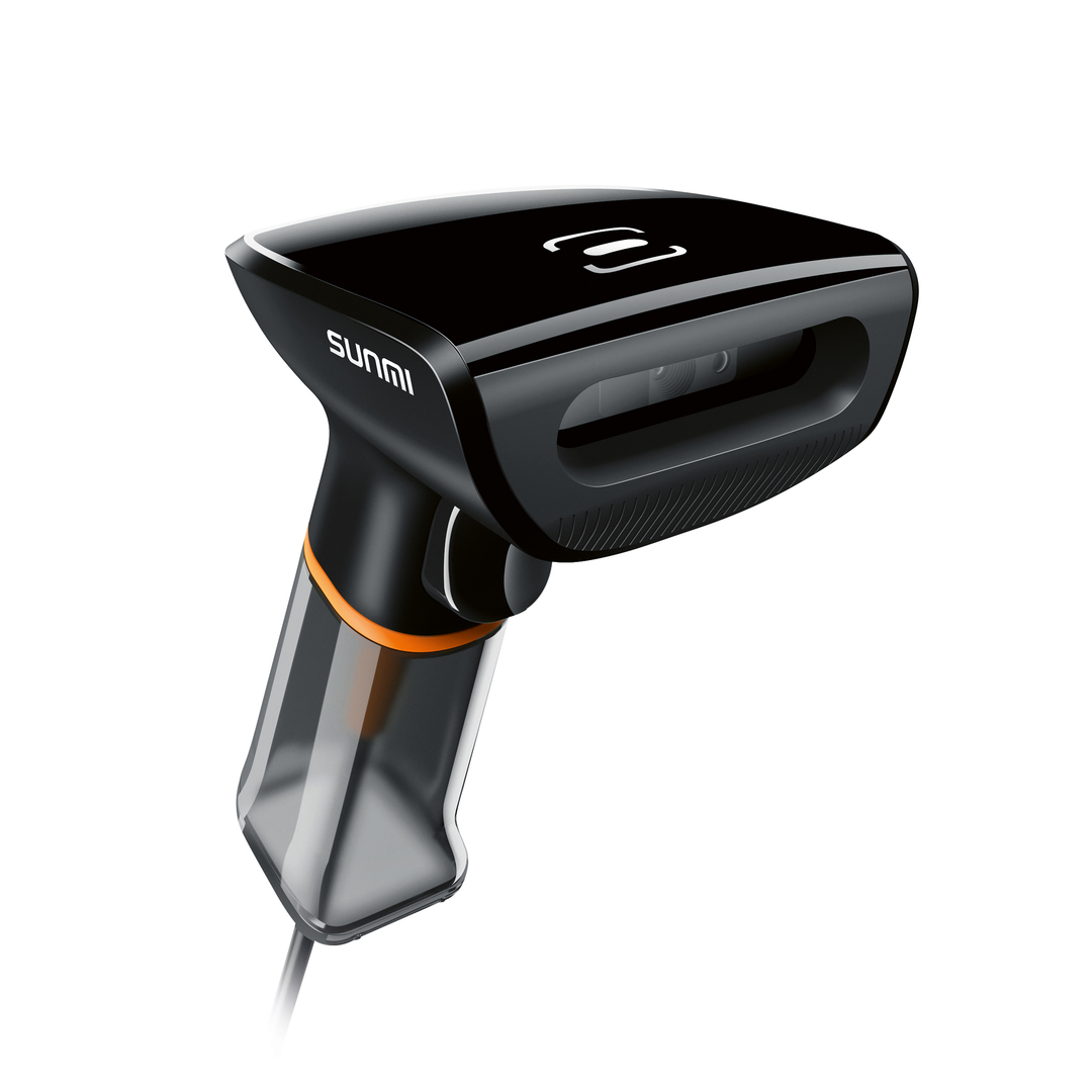 Die Gestaltung dieses Barcodescanners ist maßgeblich gekennzeichnet durch den transparenten, unten offenen Griff mit innenliegendem Kabelschutz. Bei herkömmlichen Modellen befindet sich der Kabelschutz außen am Griffende und ist zumeist starr, wodurch die Scanner insgesamt größer und unhandlicher sind. Bei diesem Produkt ist das ausgehende Kabel weich und stört nicht. Das Zusammenspiel aus matten, glänzenden und transparenten Flächen sowie orangefarbenen Details ergibt ein dynamisches Gesamtbild.