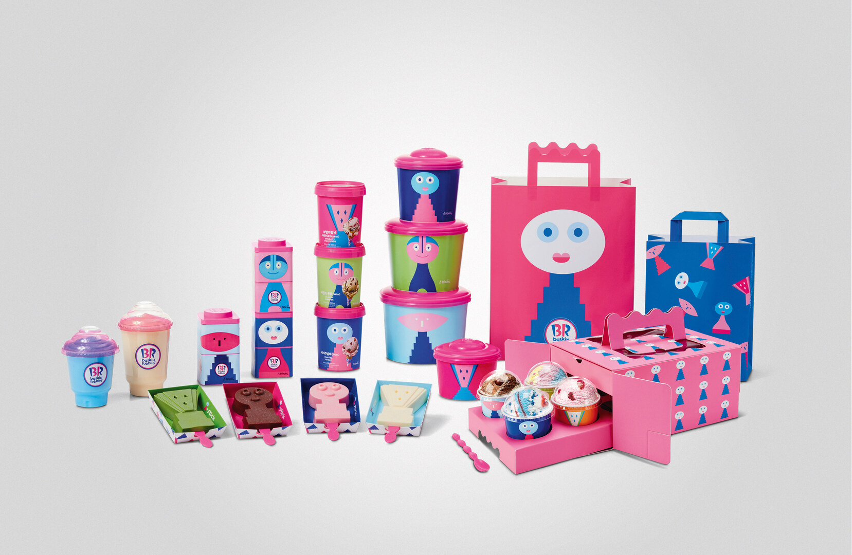 This new identity design of Baskin Robbins was created by the well known designer and architect Alessandro Mendini. It was a relaunch that was an opportunity to, once again, highlight the brand’s concept of ice cream by using the beauty of curves. Mendini’s designs always strive to see the world through the eyes of children and this philosophy is directly reflected in the branding. Bold colours and unique characters characterise a distinctive product world, the versatile motifs of which appeal to the target group and encourage collecting.