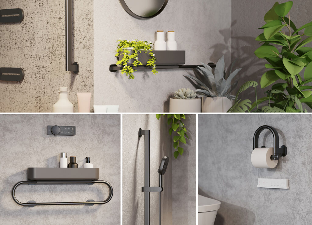 Die Griffkollektion Belay Grab Bars ist dank ihrer ergonomischen Gestaltung auch für barrierefreie Bäder geeignet. Abgerundete Kanten und ovale Profile sorgen für eine angenehme Haptik und gewährleisten sicheren Halt. Die Kollektion umfasst Haltegriffe in verschiedenen Längen, eine umlaufende Griffleiste, die zugleich als Handtuchhalter dient, eine flexibel montierbare Duschkopfhalterung, einen Toilettenpapierhalter und eine aufsteckbare Ablage. Zur Auswahl stehen unterschiedliche Oberflächen, beispielsweise Chrom poliert und Mattschwarz.