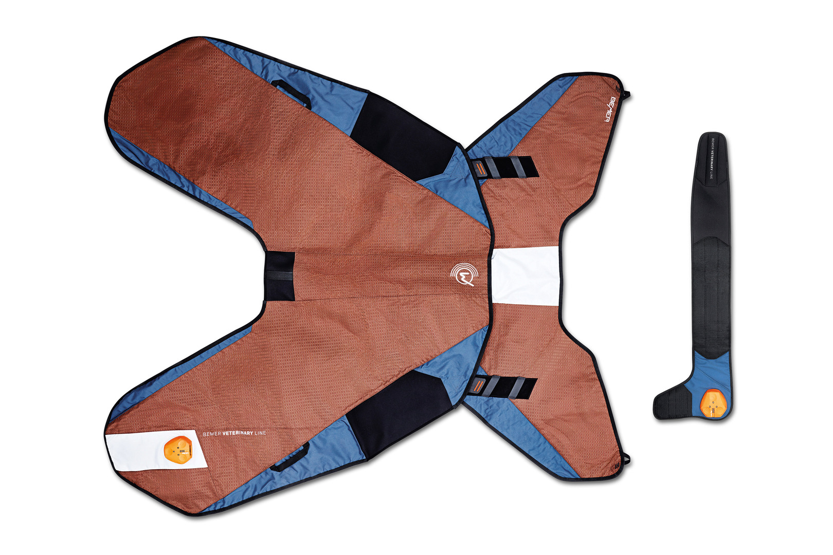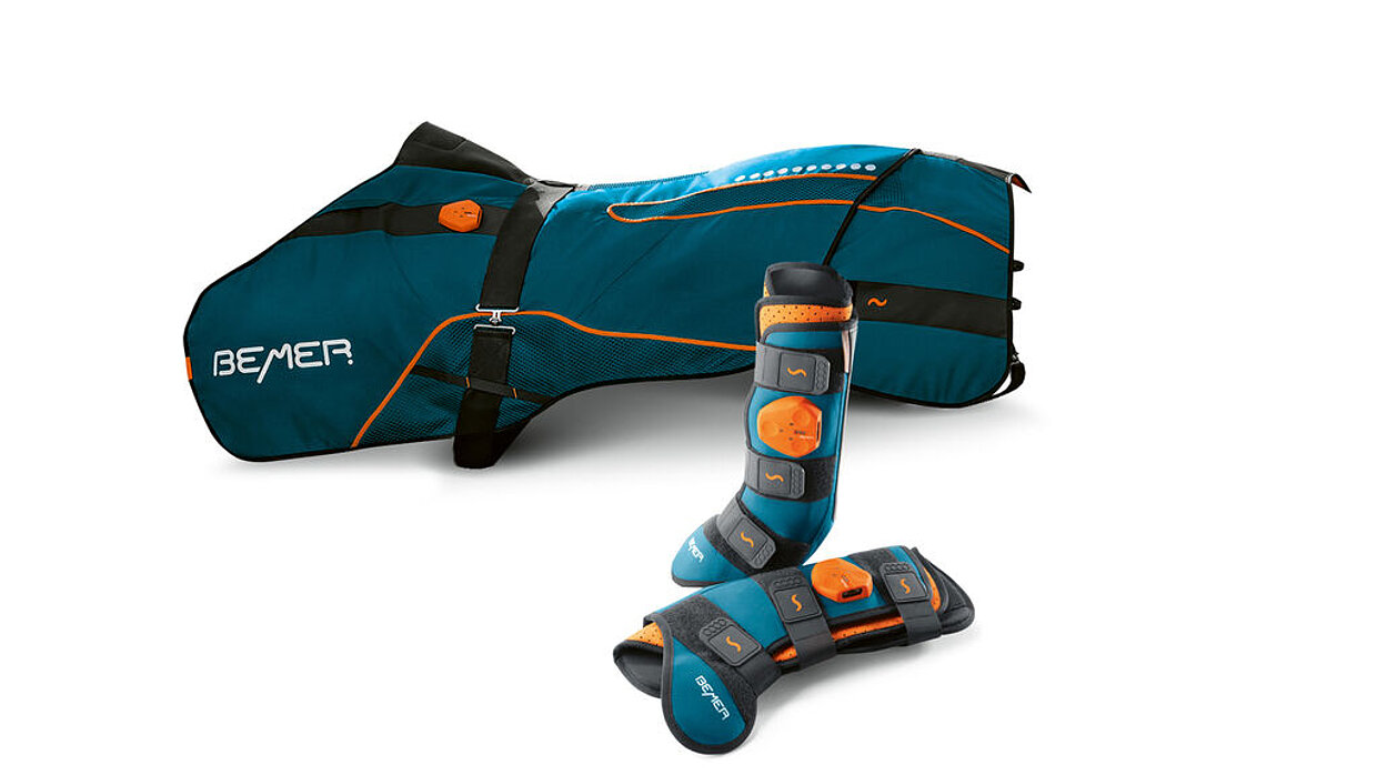 Das Therapiegerät Bemer Vet fördert die Regeneration von Pferden bei Verletzung oder Krankheit, nach Trainings oder Wettkämpfen. Es besteht aus einer verstellbaren Pferdedecke und einer Manschette für die gezielte Behandlung eines Beins oder der Halsregion des Pferdes. Über eingestickte, hochflexible Magnetspulen werden die Signale übertragen. Die Signalsteuerung ist leicht, robust, wasserdicht und intuitiv zu bedienen. Dank des leistungsstarken Akkus können die Pferde auch unterwegs behandelt werden.