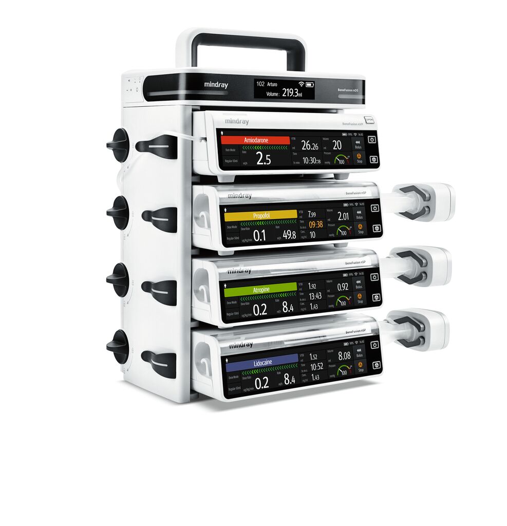Das intelligente Infusionssystem der Serie BeneFusion n wurde entwickelt, um die Sicherheit bei der Verabreichung von Medikamenten zu verbessern. Die Dockingstation kann bis zu 24 Pumpen aufnehmen, die über eine Steckverbindung angeschlossen werden. Der Touchscreen füllt mit seiner 7"-Bildschirmdiagonale die gesamte Front aus, sodass die großen Tasten treffsicher bedient werden können. Zudem nutzt die Benutzerschnittstelle ein Farbcodierungssystem, um der Gefahr von Medikamentenverwechslungen vorzubeugen.