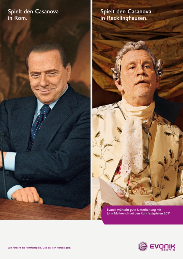 Highlight of the Ruhrfestspiele festival 2011 is the play “The Giacomo Variations” starring John Malkovich as Casanova. However, on the advertisements and posters of festival sponsor Evonik, Malkovich has to share the spotlight – with Silvio Berlusconi. They both play the ageing seducer: one of them on the theatre stage, the other one at Bunga Bunga Parties. The photographic juxtaposition presents both in a similar colour setting, while the headlines provocatively reflect on the implied common characteristics of both figures.