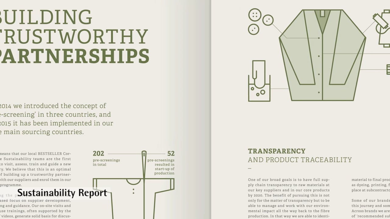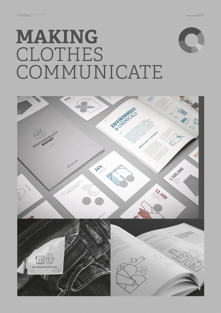 The design of the BESTSELLER sustainability report 2015 suits the fashion brand perfectly. The figures are presented to appealing effect, fascinatingly complemented by careful image selection and refined use of pictograms. The concept is overall convincing and the choice of paper is also ideally suited to a sustainability report. Its well-balanced colours are pleasing to the eye.