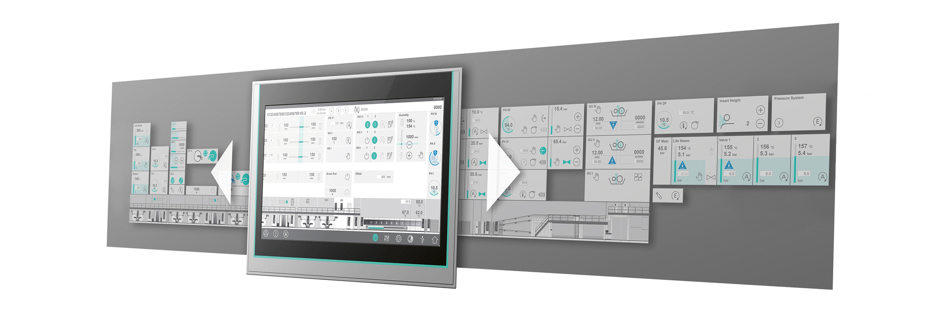 The modular BHS Corrugated Machine Control Center (MCC) is the intersection of a corrugator and its user. Its intuitive user interface with multitouch technology complies with the corrugator’s product design. Dark colours signal interaction, while light colours denote information areas. All modules of the system and their production values are shown in a panorama view. A horizontal swipe or the addition of further displays allows users to see all information. A colourful, always visible code stripe indicates the status of the system module and provides notifications concerning required actions.