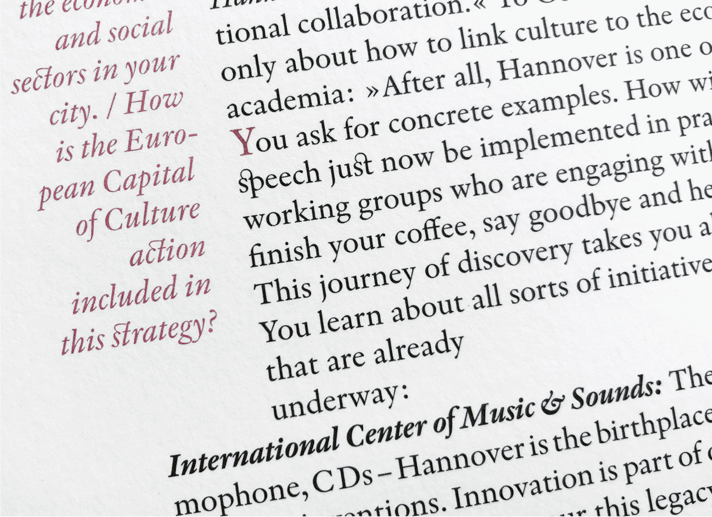 This book was created for Hannover’s bid for European Capital of Culture 2025. Its eye-catching cover is a delicate laser-cut multilayer relief, which picks up on the formal language of “Merzbau” by Dada artist Kurt Schwitters and continues as a gap into the book. It also portrays the metaphor of the agora as a central marketplace where important European topics can be discussed and experienced. Inside the hand-bound book, meticulous design elements, microtypography and fantastic illustrations build tension and serve as a highly creative companion to the bid.