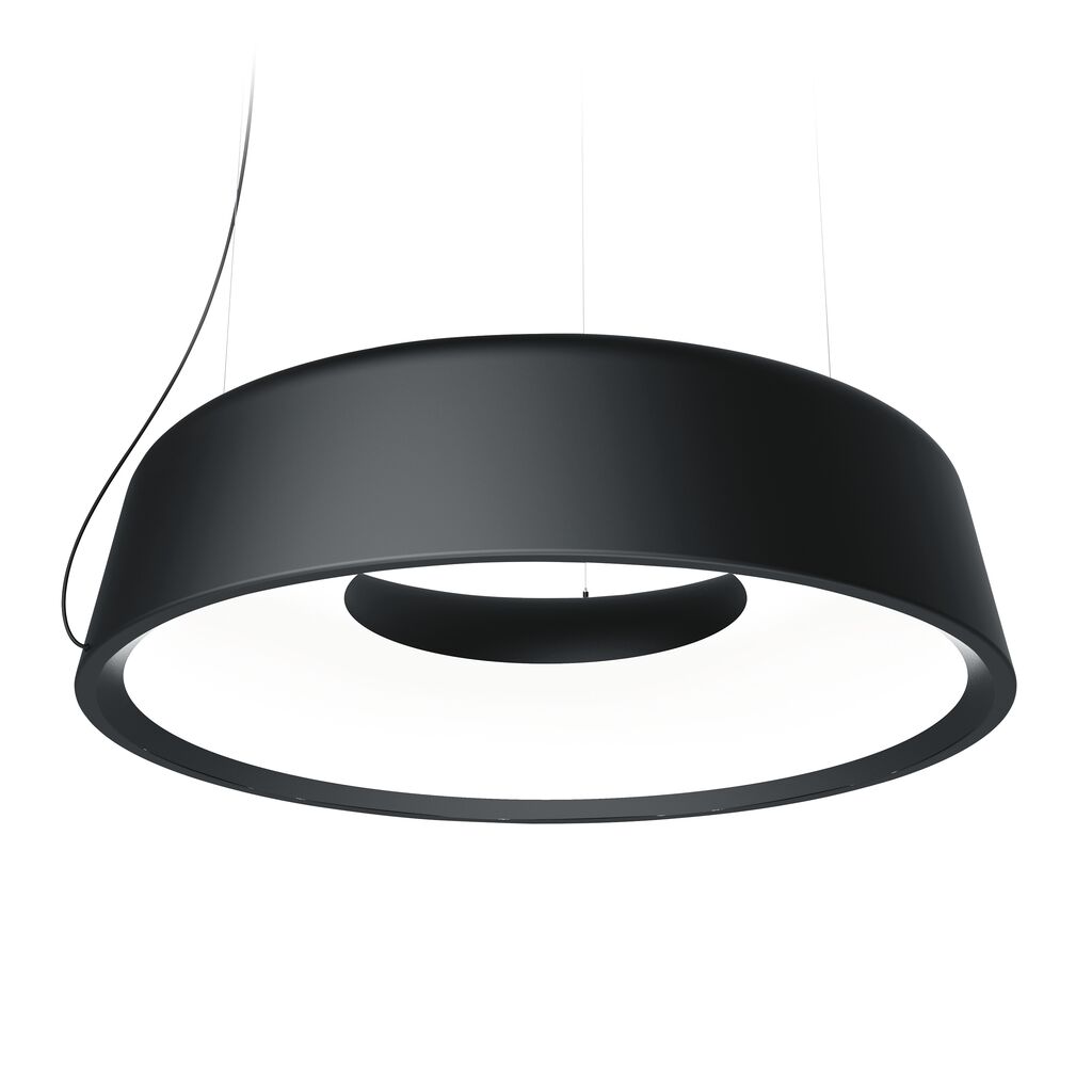 In Anlehnung an eine klassische Formensprache überrascht diese Pendelleuchte mit einer mittigen Aussparung. Die innere Geometrie wurde optimiert, um die reflektierende Oberfläche zugunsten einer besseren Lichtstreuung zu vergrößern. So entsteht eine effektvolle Beleuchtung, die unabhängig von der Montagehöhe und der Lichtausbeute angenehm blendfrei ist. Der Innenschirm ist mattweiß, während der Leuchtenschirm in einem leicht strukturierten Schwarz, Weiß oder einer beliebigen RAL-Farbe erhältlich ist.