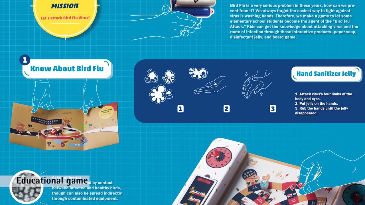 Continual outbreaks of avian influenza have strengthened the invasion of the virus, breaking the defence mechanism set up by the government in Taiwan. A “Bird Flu Intelligence Agent” goes on a mission to fight the flu, carrying a suitcase with a game inside. The game divides the complicated knowledge of the bird flu and its different viruses into three categories: attack, defence and move. With the help of this interactive and educational game, children are invited to learn how to execute their mission and protect their homes. The suitcase is also equipped with a handy, portable gun, loaded with bullets in the form of hand-washing paper, which only needs water to initiate a hand-washing attack. Furthermore, a special hand-washing jelly was prepared, a mix of alcohol and gelatine that can be rubbed on the hands in order to kill the virus. Featuring funny symbols for the viruses as well as child-oriented graphics on the cards, posters and the suitcase, the design invites children to playfully gain knowledge about the disease and understand the importance of keeping their hands clean.