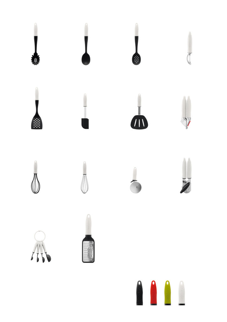 Die Bistro Gadget Linie umfasst eine große Anzahl von Küchenhelfern, die das alltägliche Leben einfacher machen – vom Pasta-Schöpflöffel über den Schneebesen bis hin zum Dosenöffner. Die Utensilien sind aus rostfreiem Stahl, Nylon, Gummi, Plastik und Silikon gefertigt. Ihr gemeinsamer Nenner: Sie schützen sowohl die Hände ihrer Benutzer als auch das Kochgeschirr. Kräftige Silikon- und Gummischichten machen die Griffe rutschfest, Nylon und Silikon bewahren Töpfe vor Kratzern. Die Küchenutensilien sind in verschiedenen fröhlichen Farben erhältlich.