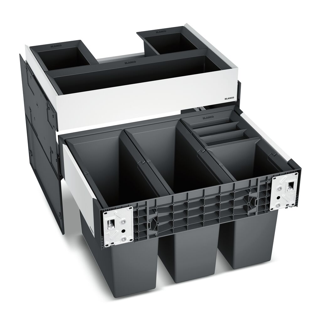 Das Mülltrennsystem Blanco Select II ist für ausziehbare Küchenunterschränke konzipiert und sorgt mit einer schmalen Rahmenkonstruktion für größtmögliches Volumen. Die klappbaren Henkel schließen bündig mit dem Korpus ab, was eine schnelle Reinigung erleichtert. Darüber hinaus sind die Kanten an der Oberseite sowie die Behälter selbst leicht angeschrägt, um den Müll besser ins Innere gleiten zu lassen. Elemente aus Metall tragen zu einer hochwertigen Ästhetik bei.