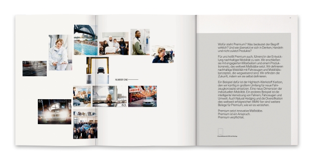 This Blue Angel certified annual report by BMW Group is the third part of a trilogy focusing on the topic of sustainability as a marketing strategy. The report is divided into four chapters, each designed to individually reflect on their topics. Held in a documentary style, the images place people at the heart of the subject matter. The repeated images on the covers serve to illustrate the link between people and cars. While the main cover shows a scene from the people’s perspective, the cover of the image brochure shows it from an external perspective.