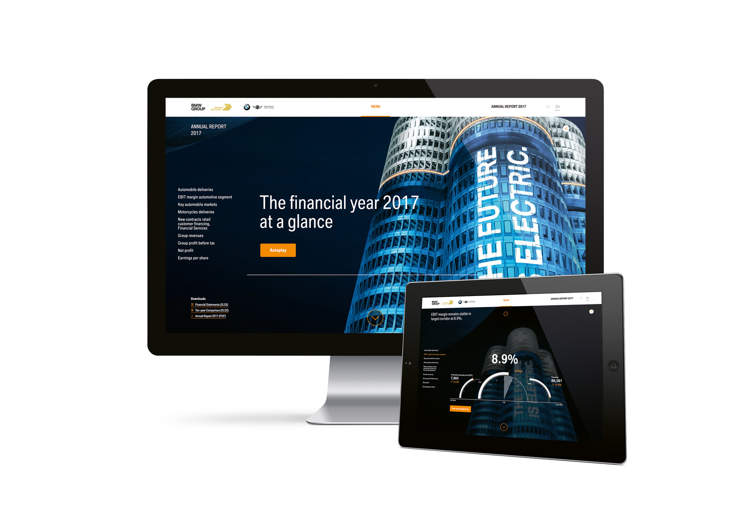 With its new strategy, the BMW Group is placing e-mobility, driverless cars and digitisation in the spotlight, as reflected in the title of the 2017 annual report. The stories in the digital magazine bear witness to this by recounting how four teams of employees are shaping the future with their ideas. Rich media content, expansive image galleries, videos and a profusion of diverse individual scroll effects alternate to create a distinctive user experience. In the online version, the “The financial year 2017 at a glance” section gives a concise summary of the key facts and figures. The presentation of key data features interactive charts using animated effects which give all the information in a very short time.