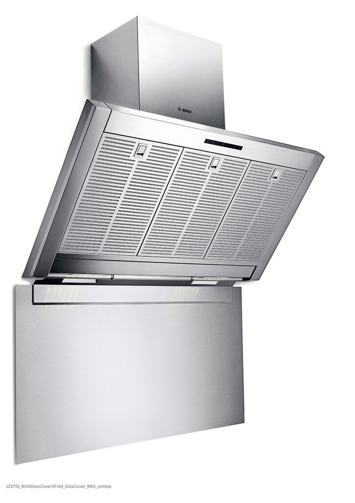 Aufgrund der ausgewogenen Proportionen und des innovativen Aufbaus fügt sich die Wandesse Glass Cover harmonisch in die Küchenlandschaft ein. Ihre klappbare Blende macht die Abzugshaube visuell und funktional unverwechselbar. Im geschlossenen Zustand werden die Filter abgedeckt, was der Esse eine möbelartige Anmutung verleiht. Ist die Glasblende geöffnet, dient diese als funktionaler und leicht zu reinigender Spritzschutz, der die Wand hinter der Kochstelle schützt. Die Glasblende harmoniert mit Glasoberflächen, wie sie in Küchen häufig zu sehen sind.