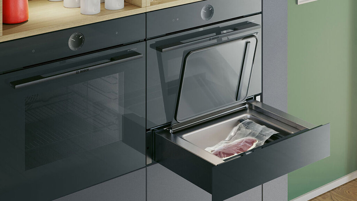 Die Kühl-Gefrier-Kombination besticht durch die Kombination von intuitiver Funktionalität und einer zeitlosen Anmutung, die durch eine Oberfläche aus gebürstetem Metall definiert wird. Bei der Gestaltung des Innenraumes wurde besonderen Wert auf Flexibilität gelegt. Das wird mit leicht herausnehmbaren und konfigurierbaren Türabstellern erreicht. Auch der zusammenfaltbare Einlegeboden lässt sich einfach wegklappen, um z. B. Platz für einen kompletten Kochtopf zu schaffen. Die nahtlose Metallrückwand fügt sich ansprechend in das Gesamtkonzept ein.