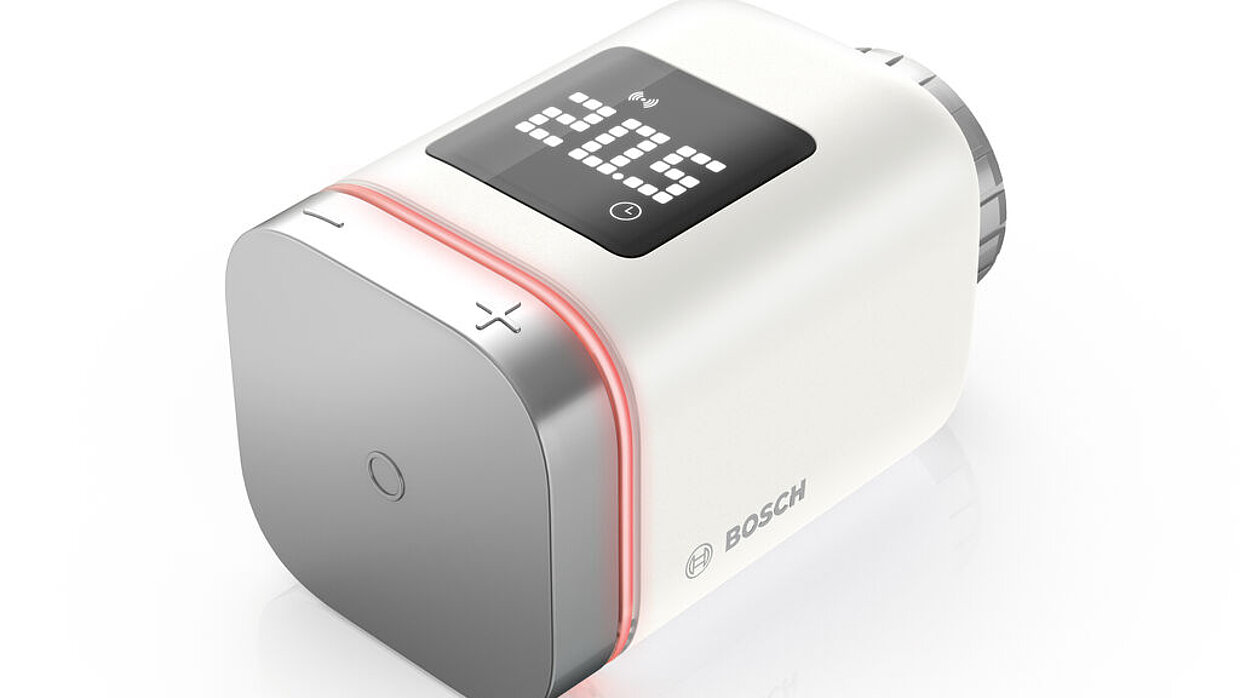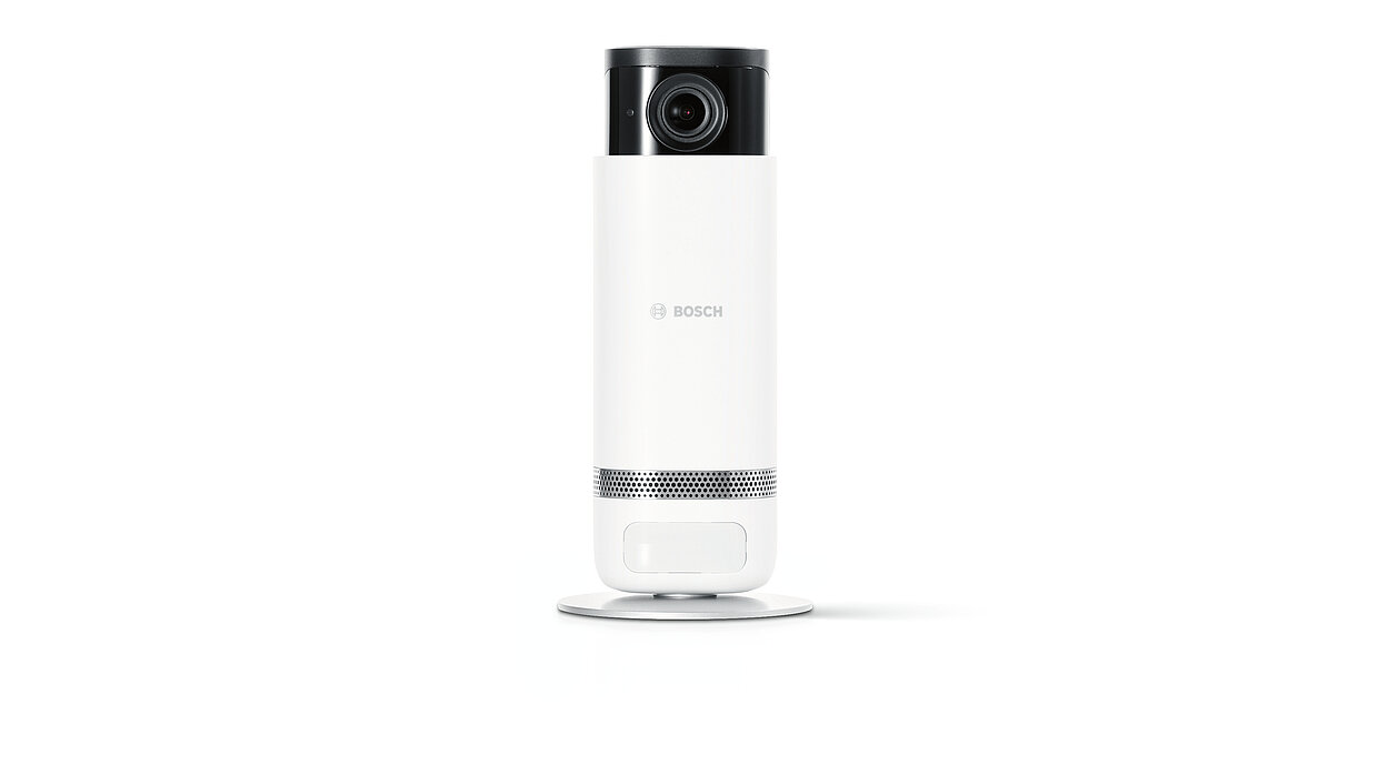 Die Bosch Eyes Indoor Camera II ist eine intelligente Kamera, die als eigenständiges Alarmsystem verwendet werden kann. Das puristische Erscheinungsbild der Kamera ist durch den glänzend-weißen Korpus in Kombination mit metallischen Elementen wie dem Standfuß und dem schmalen Lautsprecherband geprägt. Einen starken Kontrast dazu bildet der schwarze Kamerakopf, der bei Wunsch nach Privatsphäre durch einfaches Antippen oder per App-Befehl im schlanken Korpus versenkt werden kann.