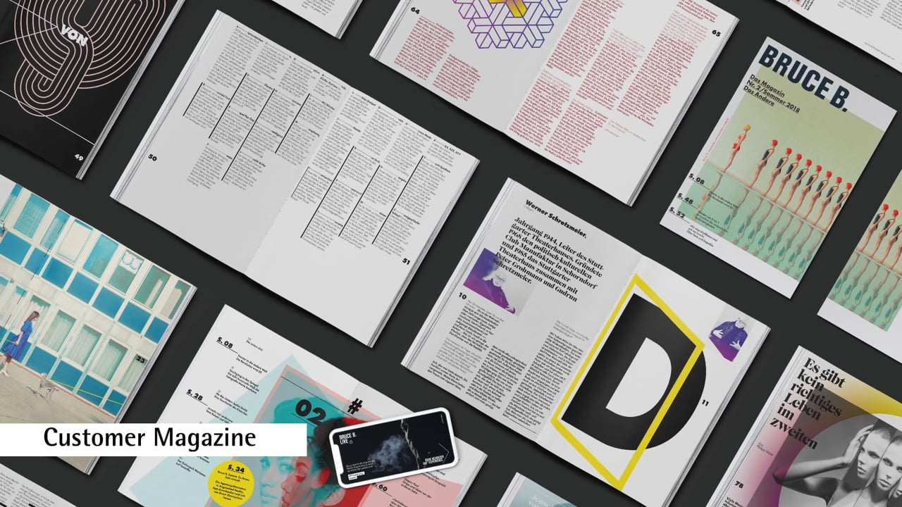 The Bruce B. customer magazine strives to intelligently connect the analogue with the digital world. With a focus on “change”, this edition addresses a topic of high interest to companies and institutions, highlighting “the other” from different perspectives. For this purpose, it uses a constantly changing text and image language, fonts that change again and again, as well as a variety of typesetting, photography and illustration styles. Thus, instead of celebrating itself as reflective self-promotion, the magazine with its exquisite open thread binding reflects the goal of the publication to provide food for thought, satisfy the high requirements on both content and design, and provide inspirational impulse for clients through the meaningful combination of print media and augmented or virtual reality. The print edition is complemented by an app featuring a presentation of the agency by its virtual founder, Bruce B., as an augmented reality experience.