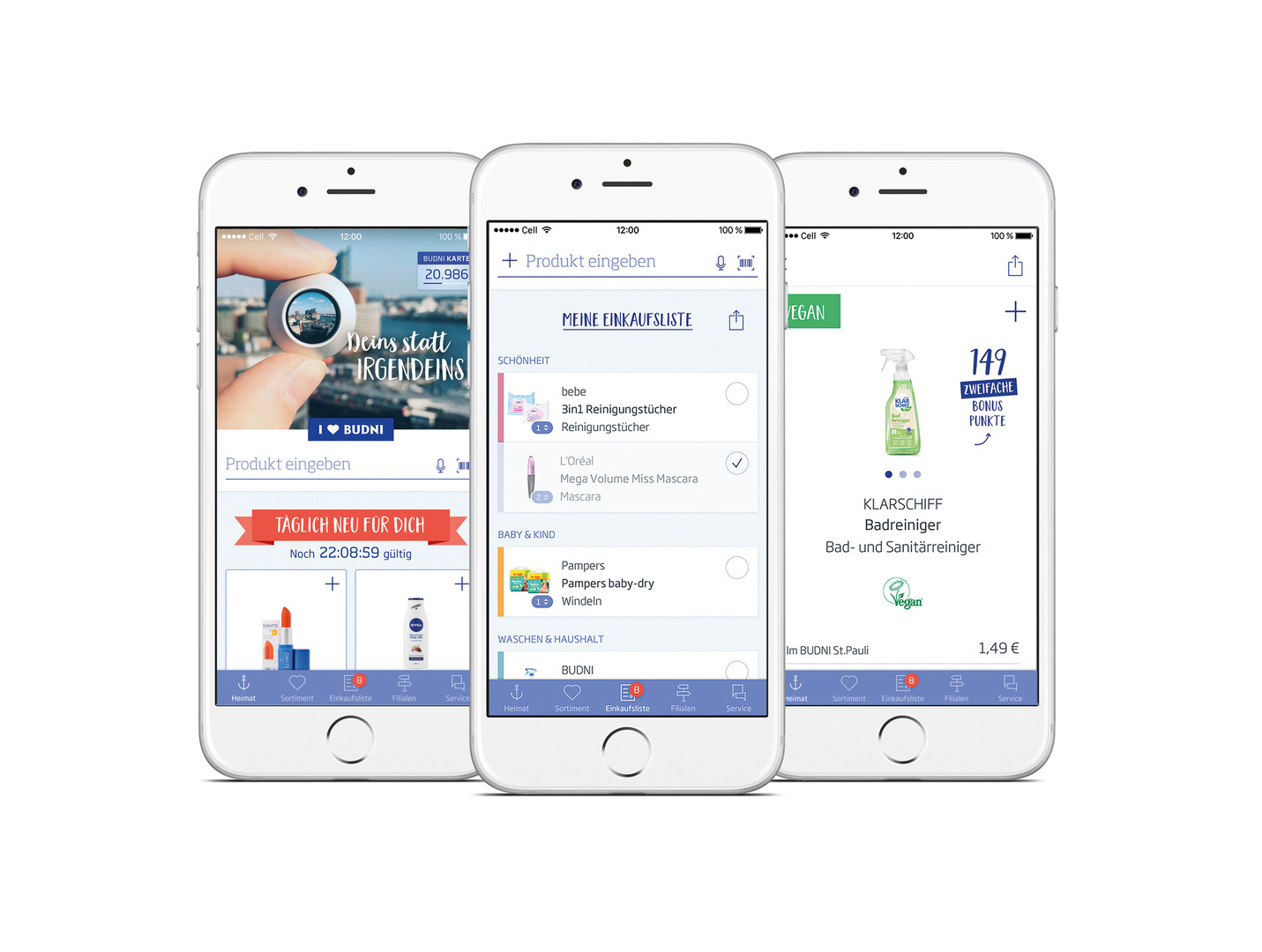With its app, the Hamburg-based drug store chain BUDNI employs the drive-to-store strategy. The company has digitalised its entire product range including availability and personalisation. With a complex back-end structure, it allows users to quickly and easily create a virtual shopping list – even via voice control – before visiting one of the stores. Maritime icons, flowing animations and a new hand-written font lend the digi- tal appearance the emotional charm of the brand, which is closely attached to its home region.