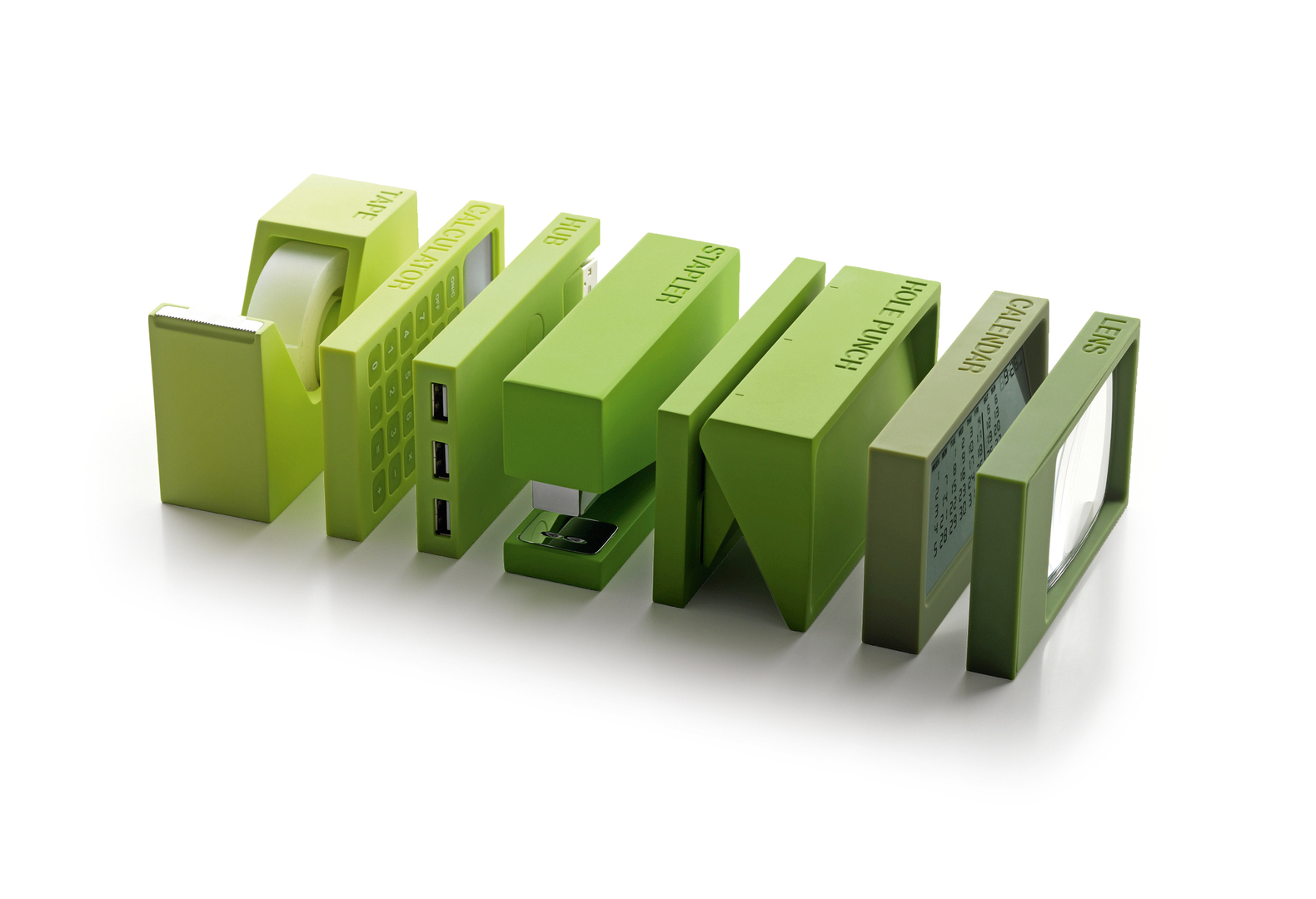 Das siebenteilige Büroset besticht durch sein strenges einfaches Design und die heller und dunkler gehaltenen Farbtöne eines Spektrums. Dank der Ausführung in ABS-Kunststoff bietet es auch haptisch eine sympathische und spielerische Handhabung.