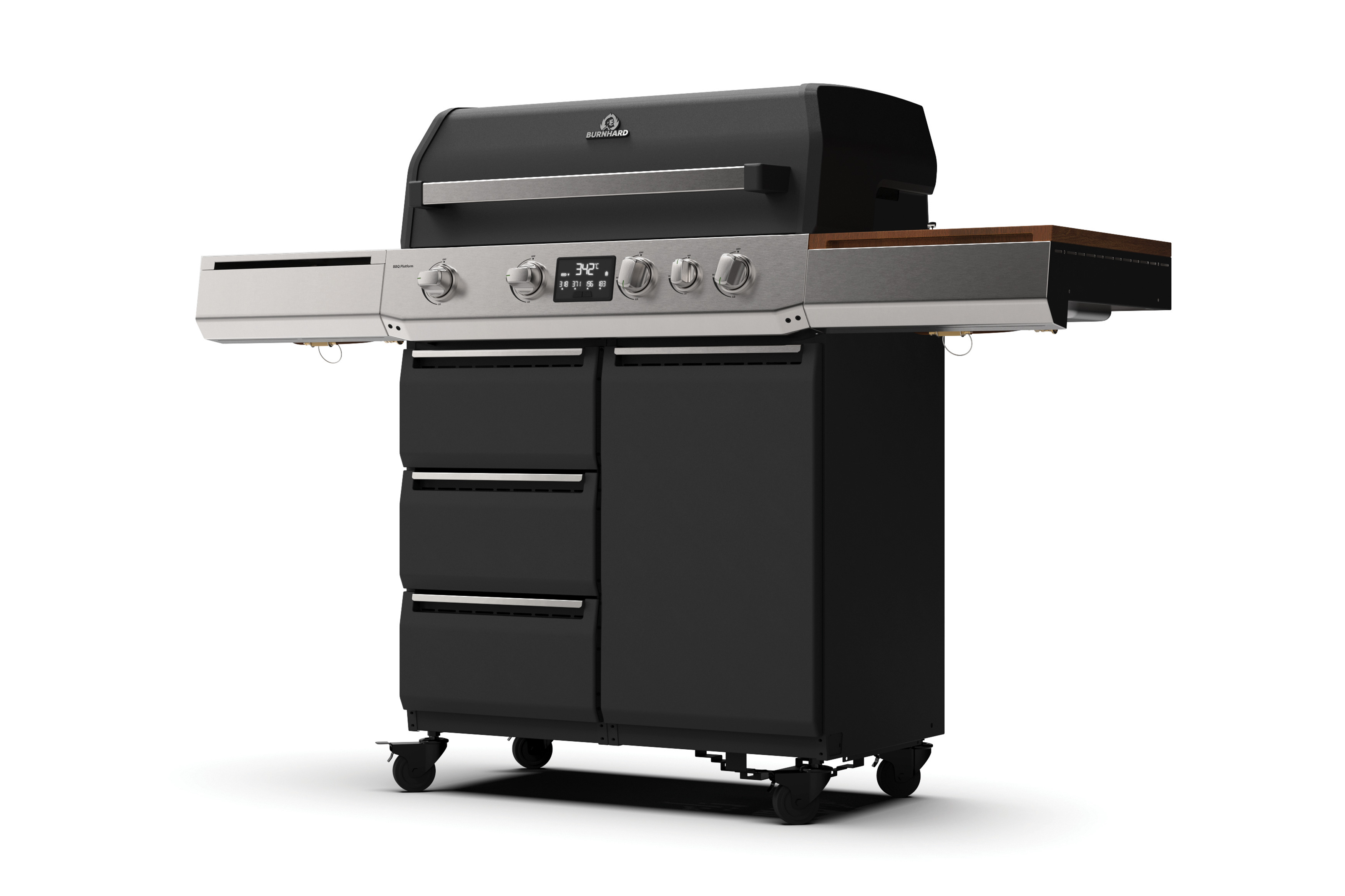 This BBQ platform is a 4-burner gas grill system made from durable double-walled stainless steel. Its modular design allows expansion into an outdoor kitchen with an easy, tool-free click-in gas supply to meet evolving needs. Custom options include swappable burners, adjustable racks, cabinets, and side tables. Digital temperature monitoring ensures precise cooking, and easy maintenance keeps the BBQ in top condition. Red Dot Award: Design Concept | Ready For Market | Garden Appliances and Garden Equipment