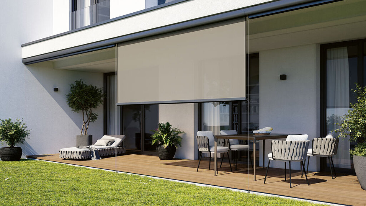 Bei dieser Sonnenmarkise begeistert eine minimalistische Linienführung, die eine hochwertige Anmutung entstehen lässt und die Funktionalität untermalt.