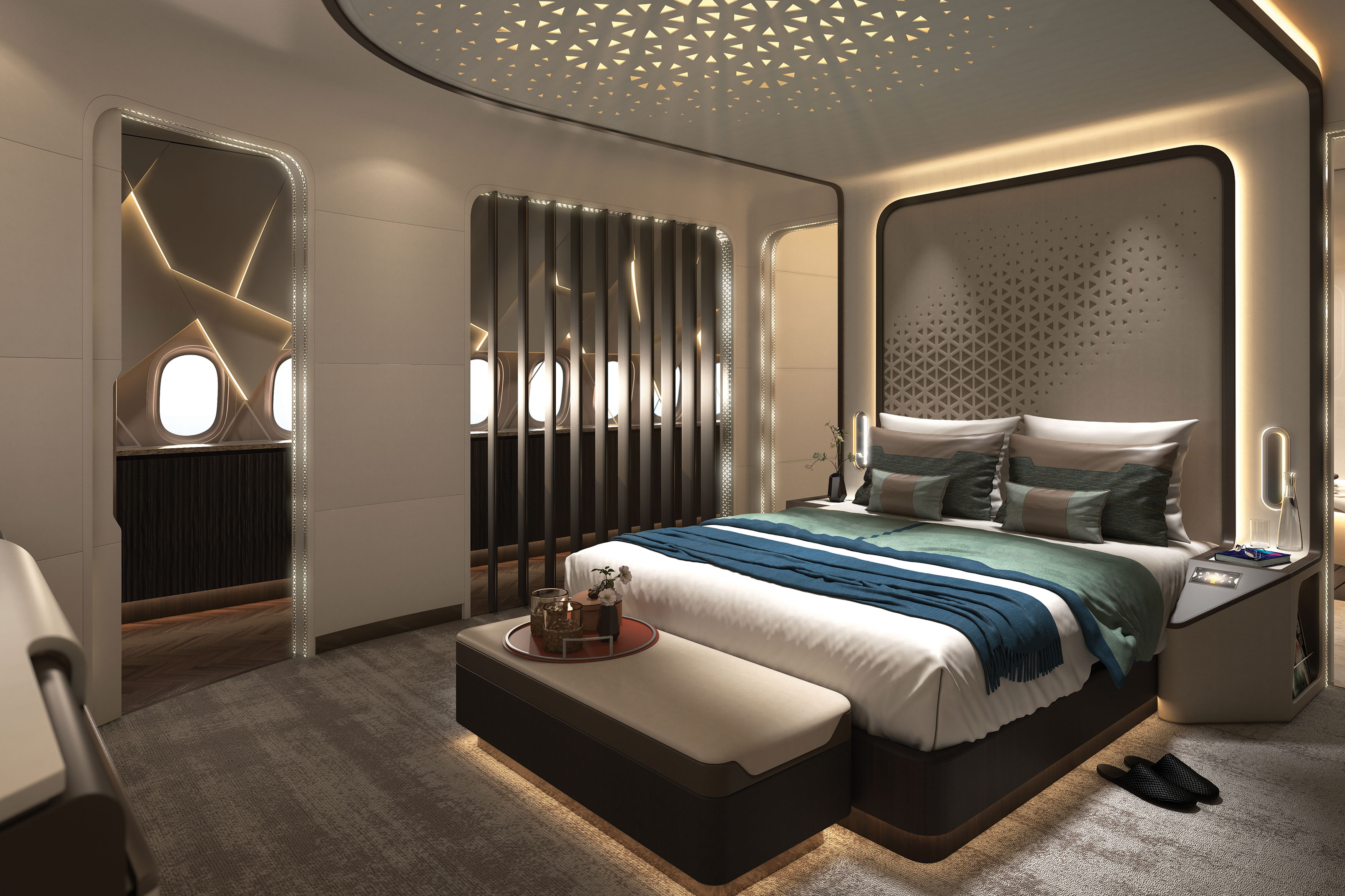 The CELESTIAL STAR, developed by Lufthansa Technik for the Boeing BBJ 777-9, caters to Middle Eastern and global VVIP clients. This cabin concept combines contemporary design elements with traditional geometric patterns, encapsulating the region’s rich cultural heritage. As the largest cabin in its class, it addresses the demands of today’s head-of-state aircraft. The layout is segmented into five distinct areas, each engineered for unparalleled spaciousness and elegance. High-quality materials like wood, brass, and marble, are integrated with classic Arabic motifs to create a culturally rich yet modern atmosphere. The cabin features a ‘Private Suite’ with an expansive shower, a 180-degree projection system for an immersive experience, and versatile living spaces. These include a ‘Work and Balance Area’, a 'Celestial Lounge’, and a ‘Conference and Dine Area’ that serves dual purposes as a meeting space and social area. Additional features include a spacious entourage area designed to accommodate delegations and staff comfortably. Central to the design philosophy is integrating versatile elements that accommodate various activities and scenarios, from business to relaxation or hosting large groups. This cabin utilises native Boeing data, establishing it as the first authentic VVIP cabin for the most spacious aircraft on the market. Red Dot Award: Design Concept | Ready For Market | Trains, Planes and Watercraft