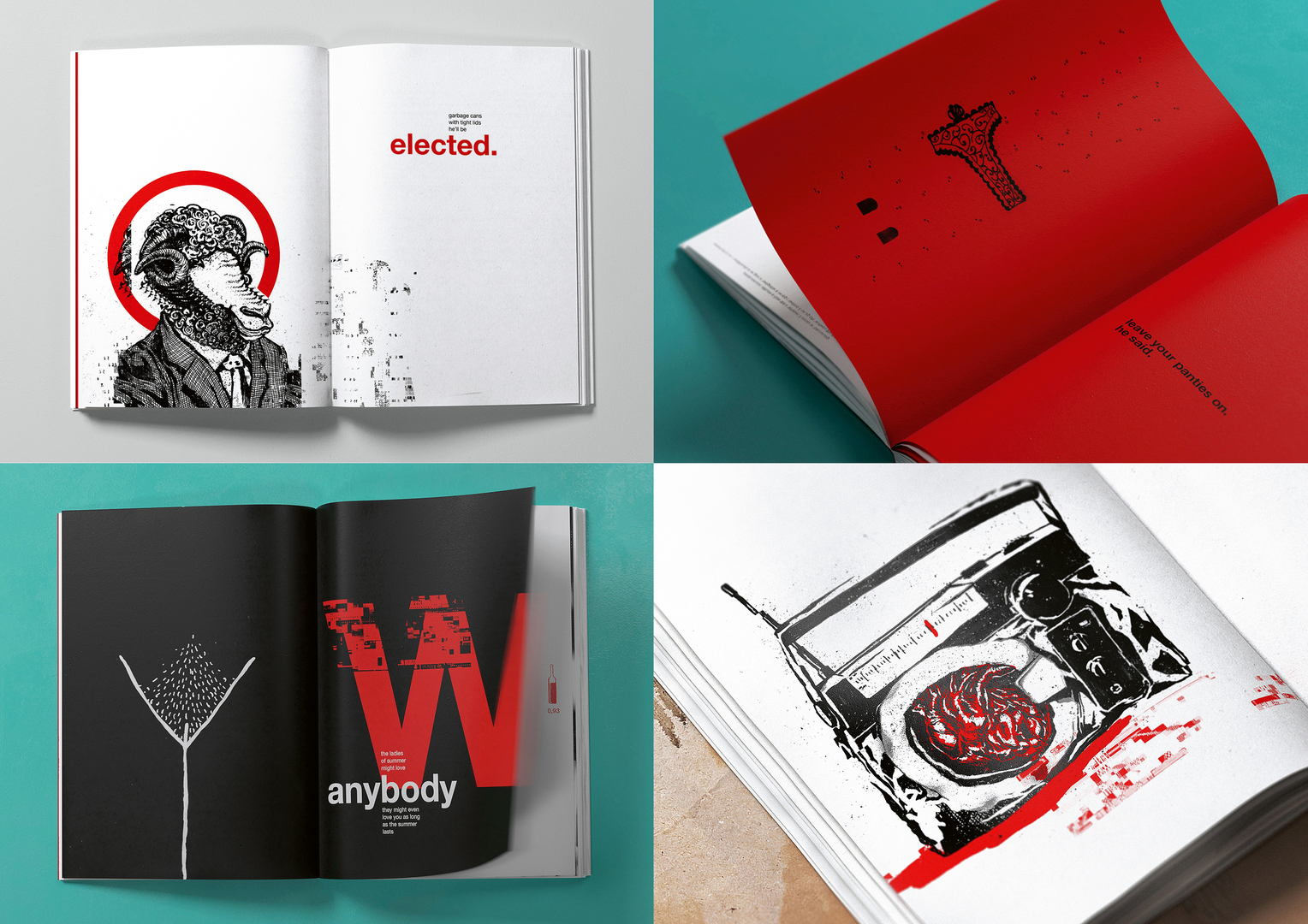 This book impresses with its captivating, high visual quality. Readers can easily relate to the life situation and moods of the author, including his crazy world of fantasies and selfdestruction, and this without reading even a single line of the author’s work. The outstandingly captivating illustrations and the experimental use of typography unleash their full potential and convey the message in a highly stimulating manner.