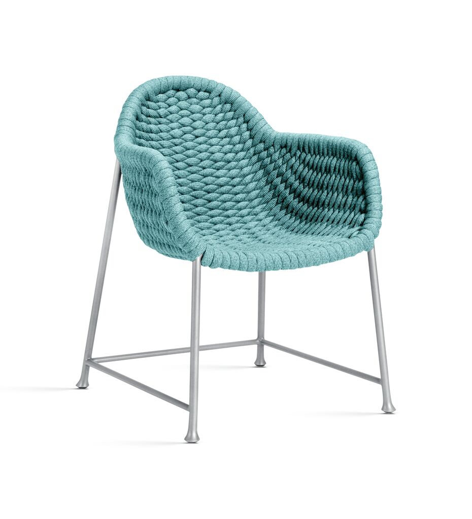 In Anlehnung an einen mühelosen mediterranen Lebensstil entstand der Armlehnstuhl Chopstix. Seine Sitzfläche wird von Hand aus Olefin-Seilen geflochten, wobei diese wetterfeste Synthetikfaser an die taktilen Eigenschaften von Baumwolle erinnert. Das textuierte Strukturmuster schafft einen spielerischen Dialog zwischen traditionellen Webtechniken und zeitgenössischer Ästhetik. Der zu einer Möbelkollektion gehörende Stuhl ist in den Farben Aubergine, Peacock und Pepper erhältlich.
