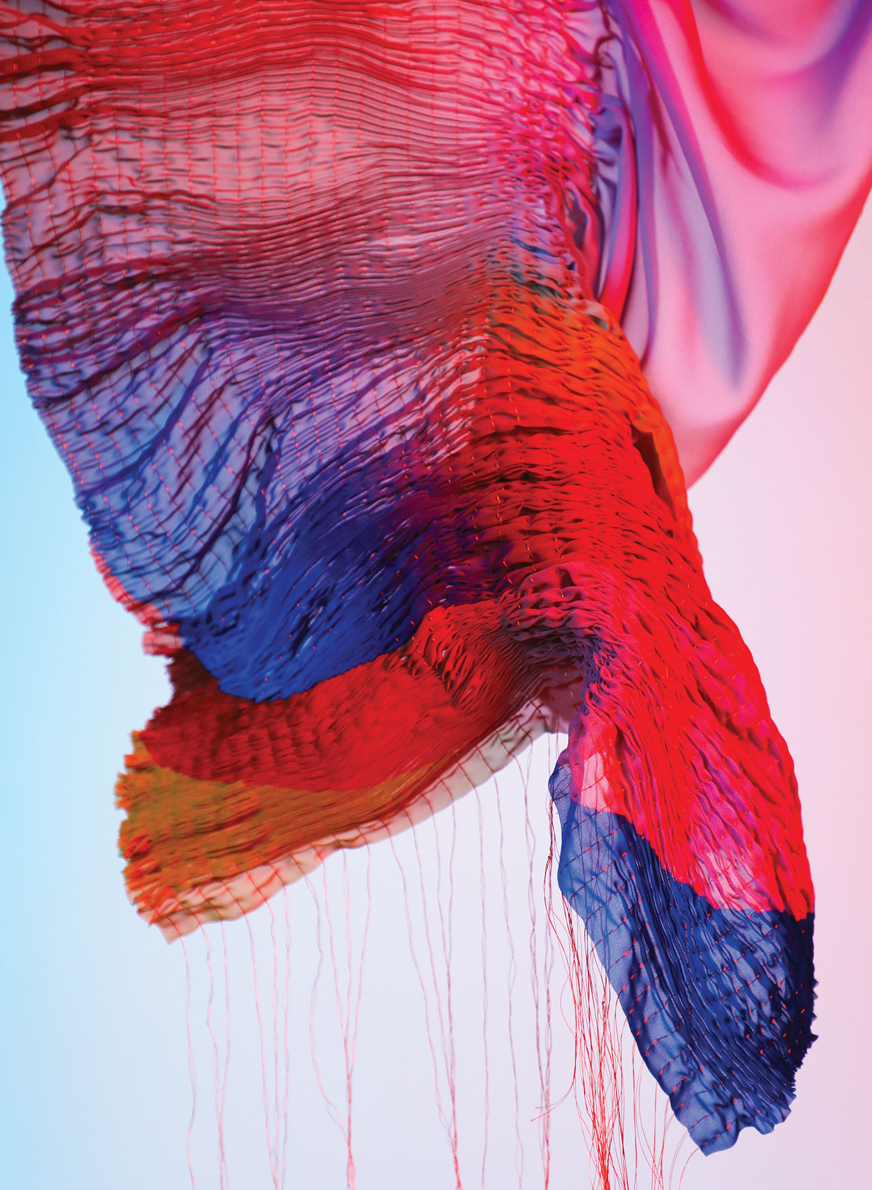 CHROMA analyses how colour theory and tactility interact to generate diverse colour perceptions. It challenges digital flatness by reintroducing three-dimensional colour influenced by light. Using hue and complementary contrasts, CHROMA creates a vibrant palette. Gradients and materials like satin and chiffon add dimension and realism, creating tones that never existed. CHROMA aims to create textiles that challenge colour perception through material manipulation. Red Dot Award: Design Concept | Red Dot: Next Gen Award | Concept | Material and Surfaces