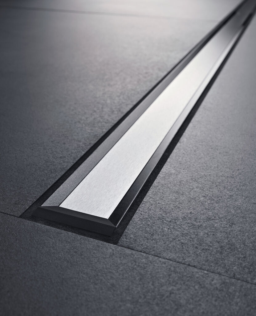 Dank des schmalen Profils und der besonders schlanken Optik verschmelzen Duschrinne und Boden zu einer harmonischen Einheit. Der Kammeinsatz gewährleistet hygienische Reinigung.
