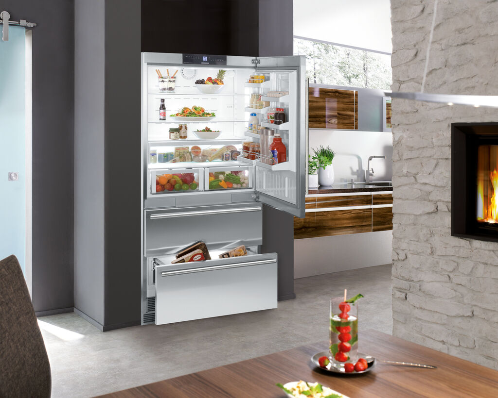 Seine visuelle Prägnanz erhält dieses FrischeCenter durch ein Edelstahlgehäuse mit HardLine-Türen. Ihre elegante Linienführung wird durch die minimierten Spaltmaße sowie die massiven Aluminiumgriffe unterstützt. Die MagicEye-Steuerung mit Touch-Bedienkomfort ist komfortabel und einfach zu handhaben. Eine LED-Lichttechnologie vervollständigt den hochwertigen Eindruck des Innenraums, wobei auch die auf Teleskopschienen geführten Gemüseschubfächer durch flächenbündig in die Seitenwand integrierte LEDs beleuchtet werden.