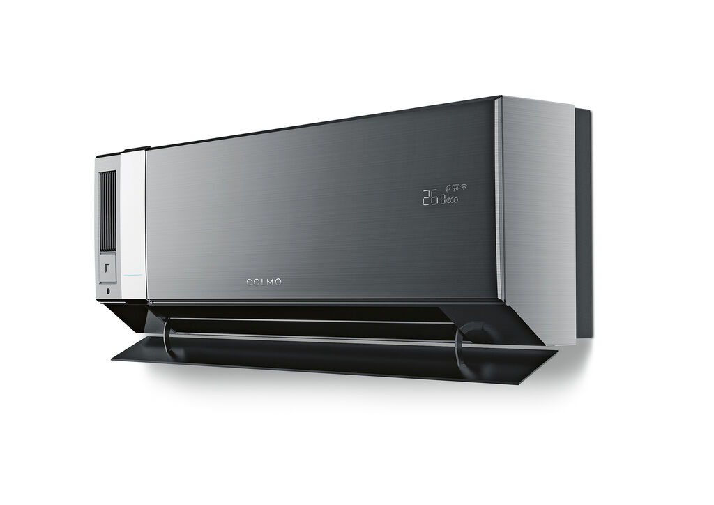 COLMO / K bietet mehr als die traditionellen Funktionen einer Klimaanlage. Neben dem Kühlen und Heizen von Innenräumen gehört auch die Zufuhr von gefilterter Frischluft zu ihrem Funktionsumfang. Im Fokus der gestalterischen Konzeption stand eine einfache, zurückhaltende Formensprache, die sich gut in jedes Ambiente einfügt. Die dunkelgraue Metalloberfläche verleiht dem Gerät eine edle Anmutung, das schlanke Schiebeelement aus gebürstetem Aluminium verbirgt Luftfilter, Luftauslass und Infrarotkamera.