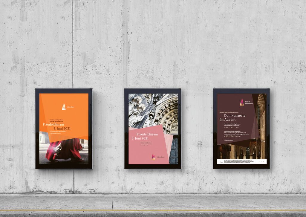 Seven isosceles triangles unite to form the new logo of the Cologne Cathedral, with the three golden triangles at the base, in the shape of a crown, symbolising the shrine of the Three Magi around which the cathedral was built. The upper triangles represent the two towers of the west facade and their reflection in the Rhine. The new word marks combine the clarity of a sans serif grotesque font with the sensibility of a Gothic minuscule, thus referring to the architectural style of the cathedral.