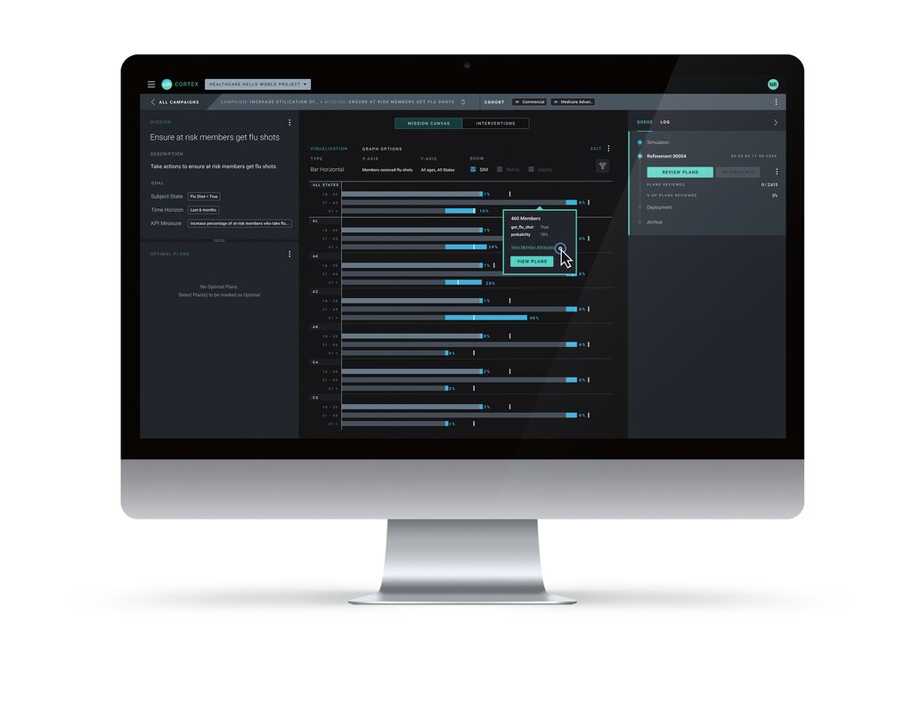 Cortex 6 is a new interface for implementing AI campaigns in businesses. One person or a small team can create campaign-driven solutions for scenarios with tens of thousands of outputs, without programmers having to write code in a lengthy process. The system provides users with building blocks for setting goals, defining actions and predicting the effects of those actions. It is scalable and thus suitable for a wide variety of areas where predictive, personalised action is needed.
