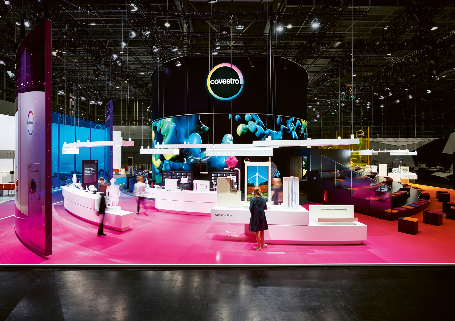 The holistic concept of this brand presence for the company Covestro at the trade fair “K” in Düsseldorf, Germany, placed people and materials centre stage. The aim was to convey the brand values of curiosity, courage and diversity. In order to make these values tangible, smart digital and interactive elements were incorporated, as well as an augmented reality show on the UN’s sustainable development goals, to which Covestro has committed in various projects. The core element was a large “Talk Area” focused on the presenta-tions by experts and on the company’s partners.