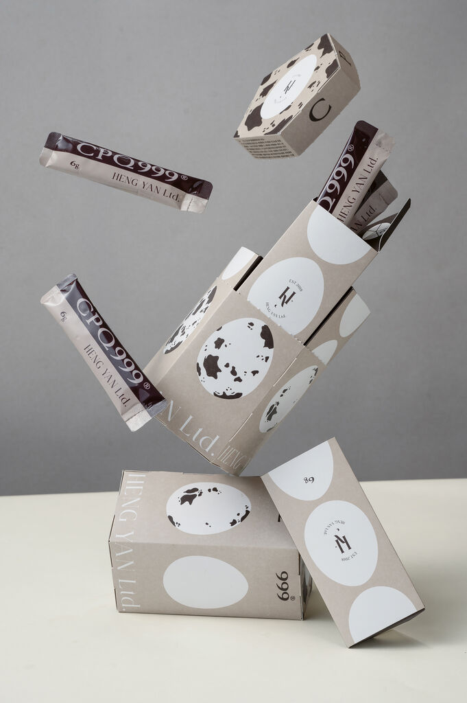 Die Verpackung des Collagen-Ergänzungsmittels CPQ999 assoziiert die Perfektion einer Eierschale mit der Wirkung des Produktes. Inspiriert von taiwanischen Wachteleiern entstanden Illustrationen, die auf der fünfeckigen Umverpackung den Übergang einer gefleckten Eierschale hin zu einer perfekten Oberfläche abbilden. Im Inneren befinden sich wiederum fünf dreieckige Schachteln, die die einzelnen Sachets sicher verwahren. Die nachhaltige Umsetzung des Packagings zeigt sich u. a. in Steckverbindungen, die Klebstoff überflüssig machen.