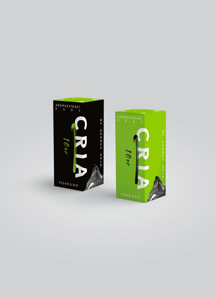 Launched in 2019, CRIA is an emerging brand targeting millennials and generation Z seeking high-quality CBD products. The neon green and black colours are attention-grabbing characteristics of the brand appearance. The brand’s youthful and dynamic image is highlighted by a high-contrast typographic combination of casual brush handwriting and sans serif lettering, which also emphasises the brand’s straightforward and honest attributes. The English slogans reflect the brand message with a concise and global approach. Black-and-white images of sporty young people and the Matterhorn represent the target group and the origin of the products.