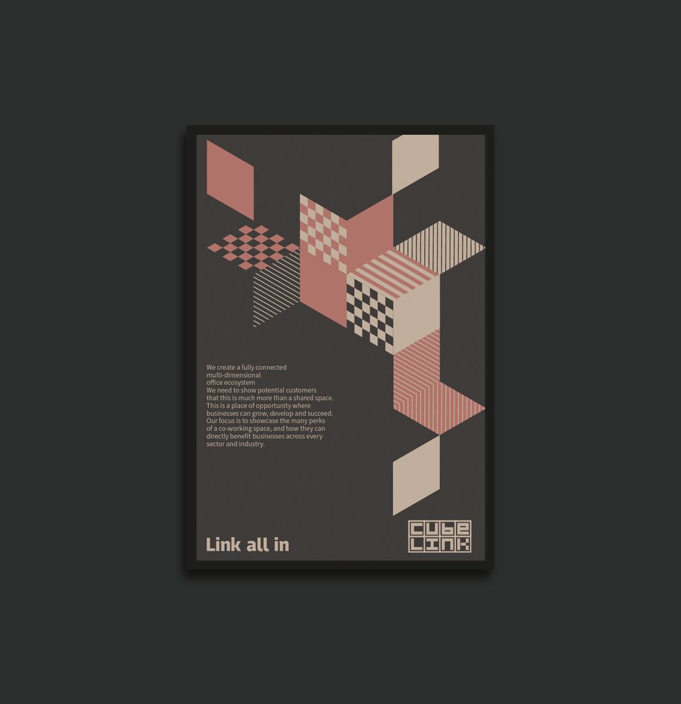 The brand design for CubeLINK followed the objective of creating a visual system that allows flexible combinations. Its balanced implementation with a coherent colour world and a dynamic visual language creates a sophisticated and aesthetically appealing overall impression. Featuring eight letter boxes, the logo reflects the ideas of interaction and shared office space in the form of “cubes”, which give the brand its name. The connected yet flexible boxes express the characteristics of this work platform, which connects an efficient workforce to a physical and inspiring shared office space.