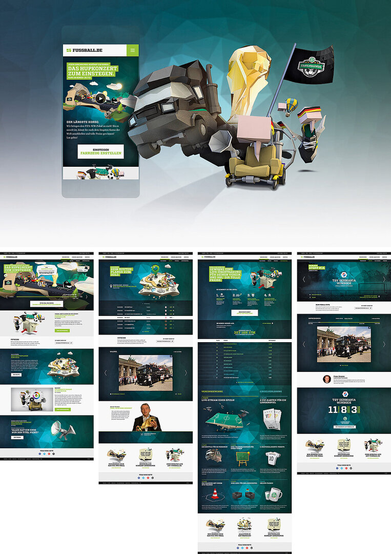 After Germany had won the FIFA World Cup in 2014, the German Football Association celebrated the victory with a tour of Germany called “Lap of Honour”. The microsite accompanying the event featured a low-poly style of hexagons inspired by the pattern on the football. On the website, visitors were encouraged to create an individual vehicle choosing from two million variations in order to follow the world cup trophy on a digital fan parade. Thus, a virtual papercraft world, which had a clean but playful look, mutated into a lively experience.