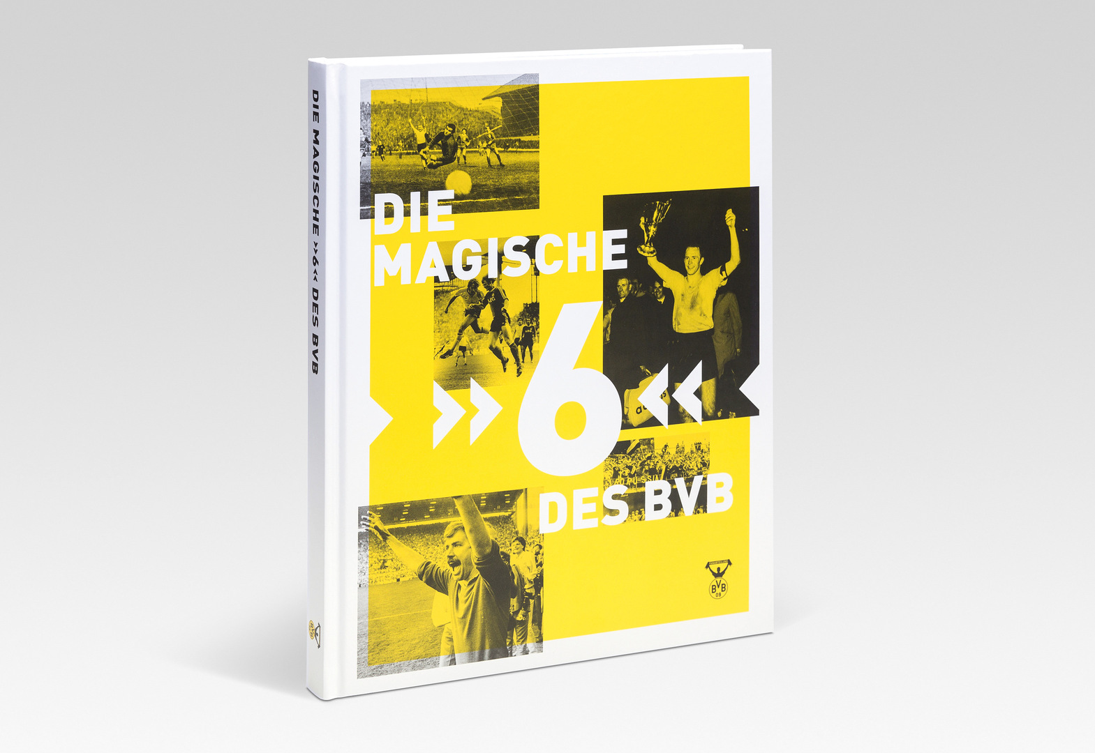 The book “The magic ‘6’ of Borussia Dortmund” tells the story of the traditional German football club and the history of the city of Dortmund, which are closely interwoven. In the club’s chronology it is noticeable that many important events happened in years that ended with a “6” leading to the myth of the “magic ‘6’”. Each chapter starts with the city’s history marked by thick yellow horizontal lines, while diagonal running dates indicate the main sections of the BVB history. The decades in between are represented on yellow pages, in a layout turned by 90 degrees. Thus, this black-and-yellow guideline distinguishes between the club’s and the city’s history.