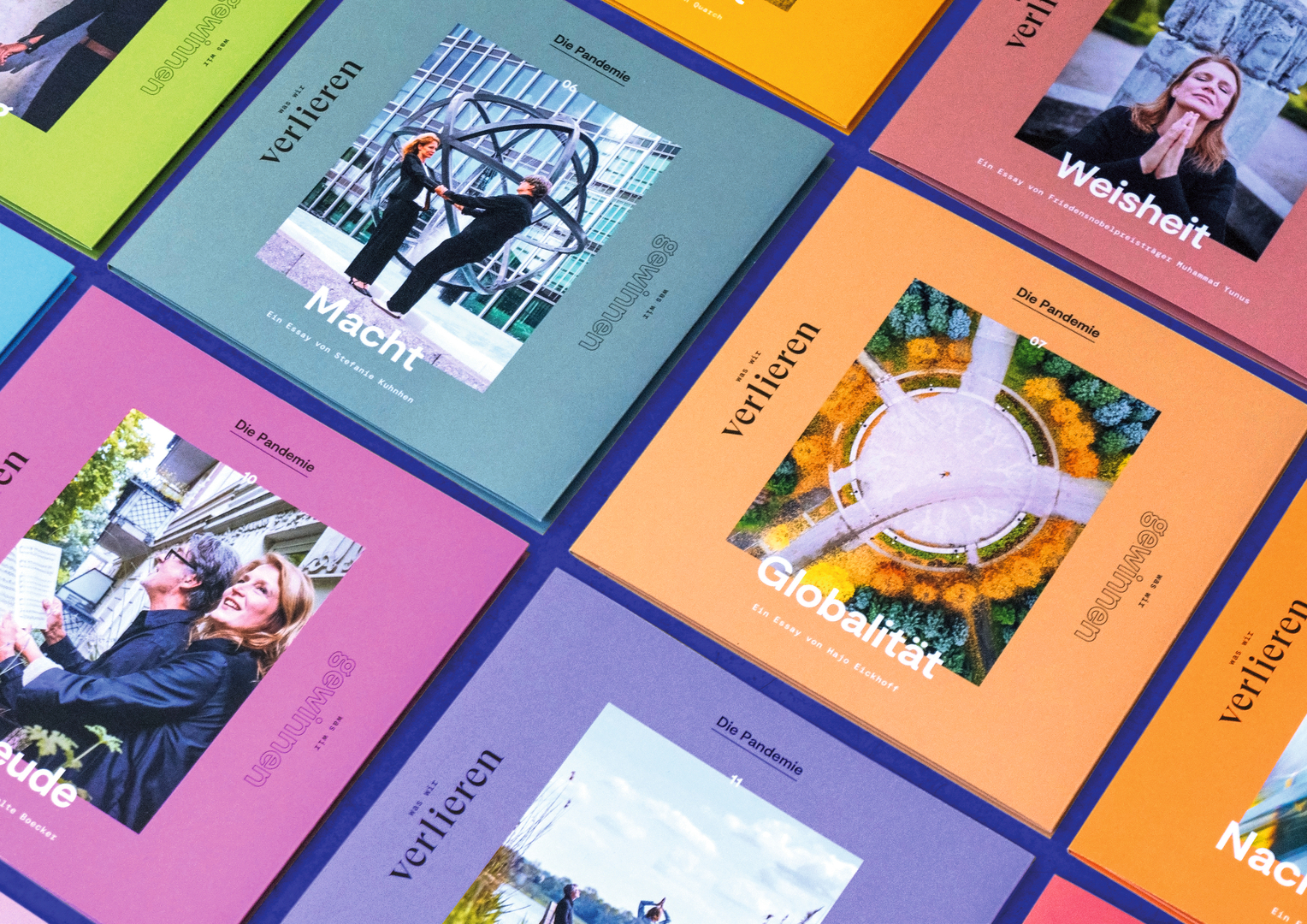 This 15-part series of writings, which addresses values such as security, wisdom and joy, is intended as a source of ideas for social transformation throughout the Corona crisis. Its design radiates confidence and optimism. A crisp feel is characteristic of the individual volumes. The contents pages, which are reminiscent of daily newspapers, are sewn into the cover with colour-coordinated lockstitch binding. The mix of a contemporary sans-serif font in a monospace variant and generously set humanistic antiqua visualises the tension between crisis and opportunity.