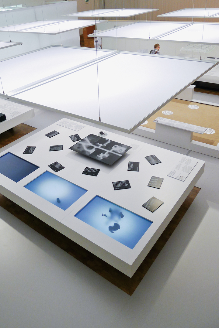 The exhibition “The future at your feet” is based on an innovative research undertaking focused on soil solutions of the future. The involved projects by six creative teams of designers, artists, architects and film-makers are visualised and presented three-dimensionally as walk-in installations, film animation, or in the form of models. Six identical presentation surfaces are individually designed to suit the particular concepts. Together with the exhibits, the integrated media, and the panels of light suspended above, they form a stand-alone presentation module reminiscent of a laboratory.