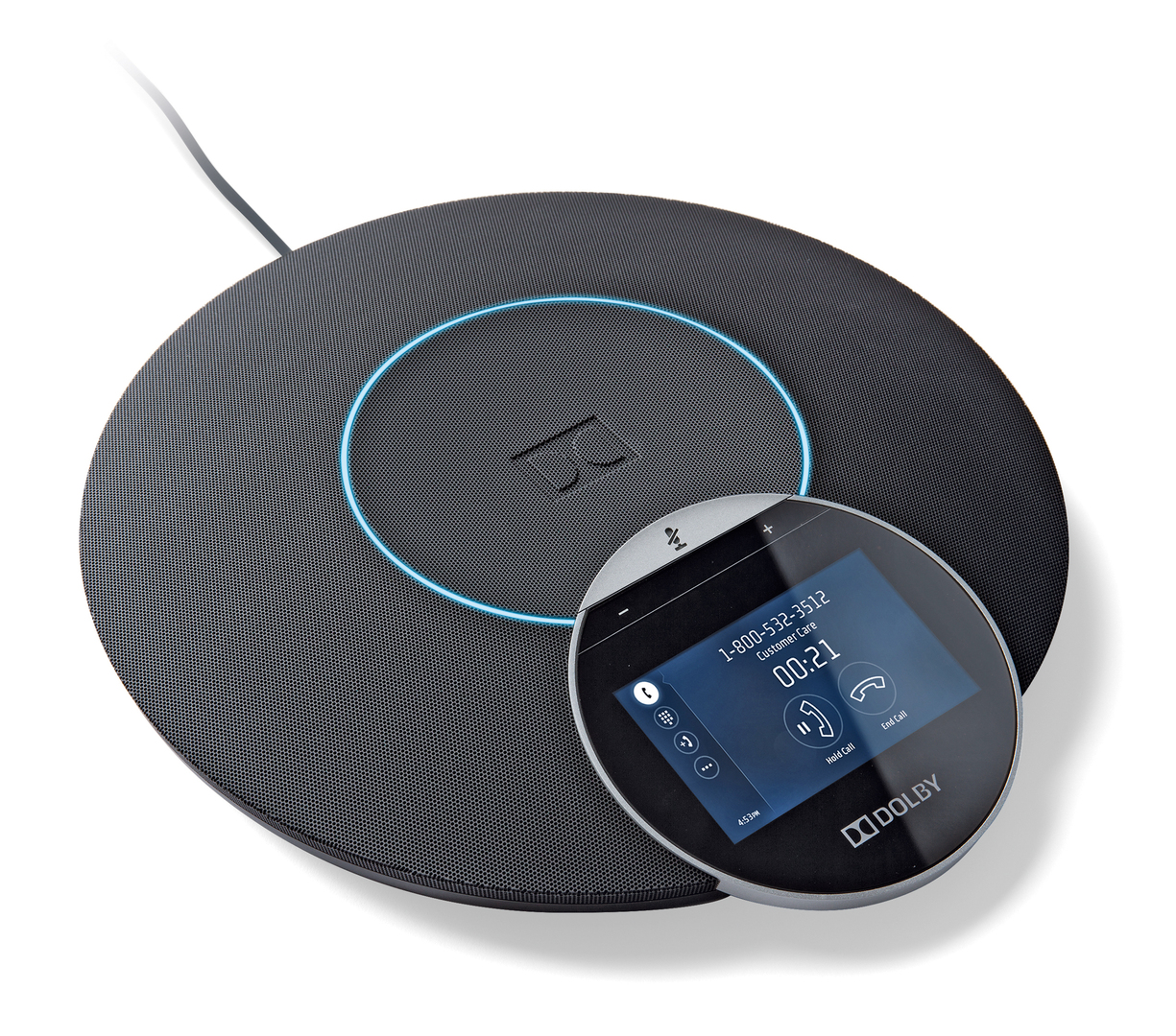 Das Dolby-Konferenztelefon verfügt über mehrere Mikrofone und eine leistungsstarke Software. Alle Sprecher sind deutlich hörbar, und Zuhörer können klar unterscheiden, von welchem Punkt im Raum die jeweilige Stimme kommt. Die runde, perforierte Metallhülle mit konkaver Mitte stellt die vollständige Erfassung sämtlicher Beiträge im Raum sicher und lädt zudem zur Diskussionsbeteiligung ein. Das Bedienfeld mit Touchscreen ist intuitiv erfassbar. Ein gut sichtbarer heller Lichtring zeigt den Anrufstatus an.