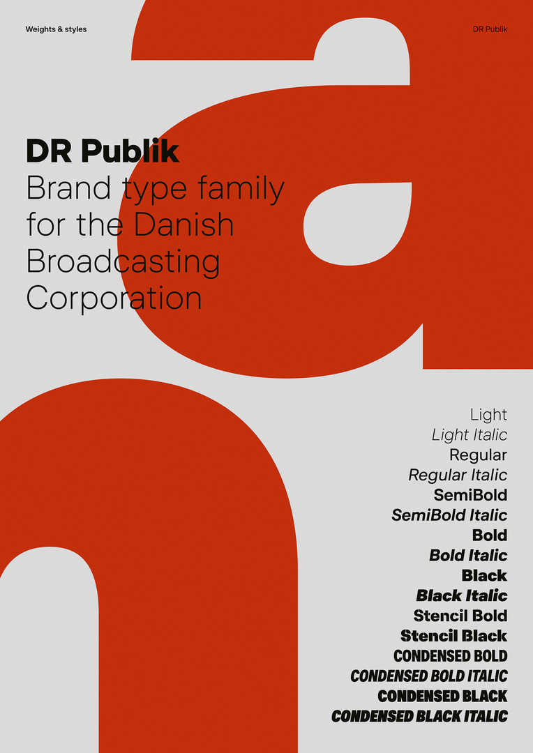 Danish Broadcasting Corporation (DR) is Denmark’s oldest and largest electronic media enterprise. Text is an essential part of DR’s content. The bespoke type family DR Publik was designed to strengthen legibility and ensure visual consistency on all platforms, enhance corporate branding and create a coherent visual expression. The streamlined, no-fuss type family corresponds to the Scandinavian design aesthetic and is characterised in particular by nearly monolinear stroke widths and horizontal or vertical terminals.