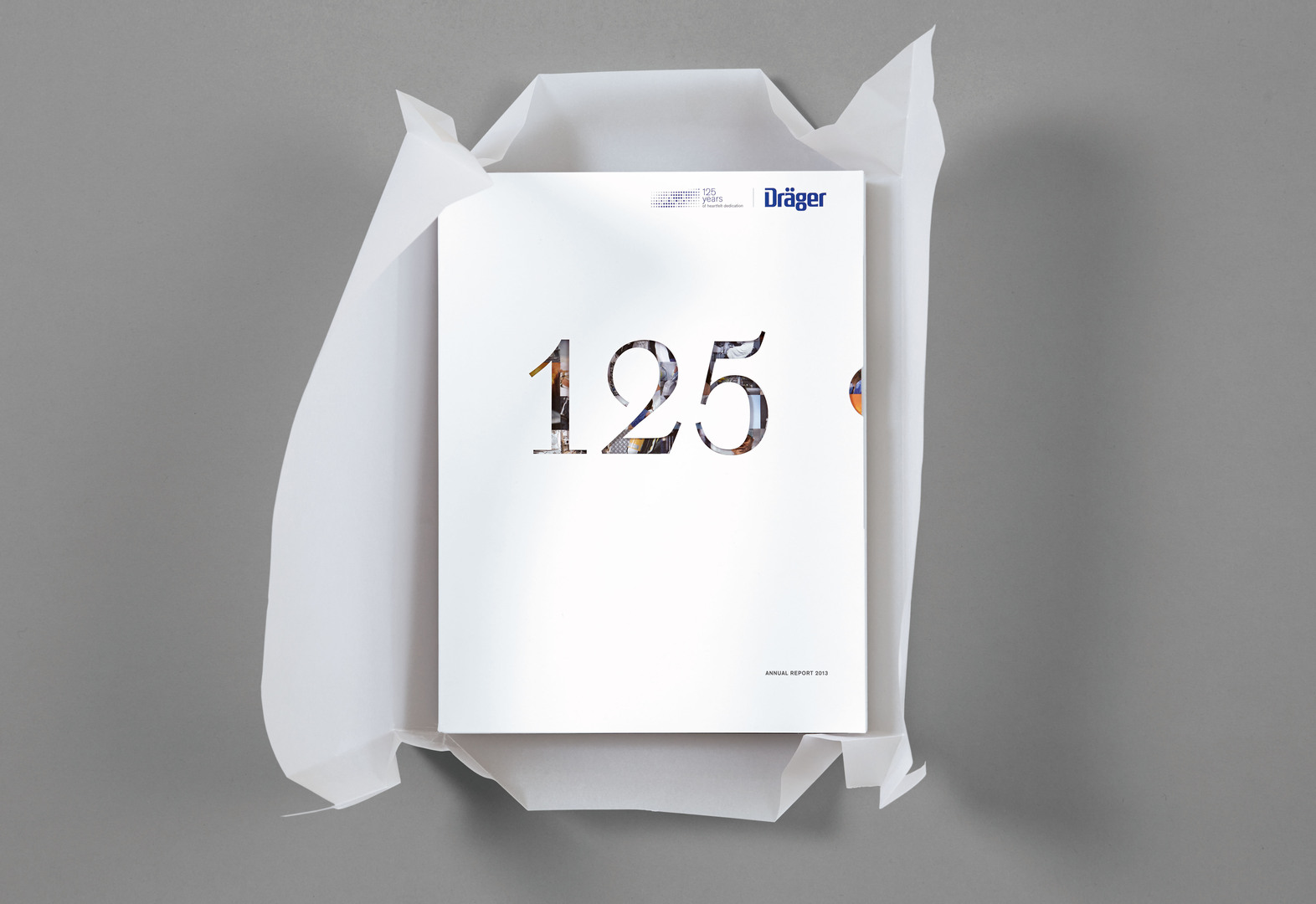 The 2013 Dräger Annual Report focuses on the 125th anniversary of the company’s founding. The figures on the title page attractively stress this milestone. Under the motto “Reflections” the report considers both the past and the future. Three Dräger customers – two doctors and a mine rescuer – each recount the personal reflections that link them to Dräger products. In this way, the timeless dimensions of the brand value are communicated. The front cover has a pocket in which there is an extractable, small-format portfolio. It is entitled “Technology for Life” and describes product development from the company’s beginnings up to the present day.