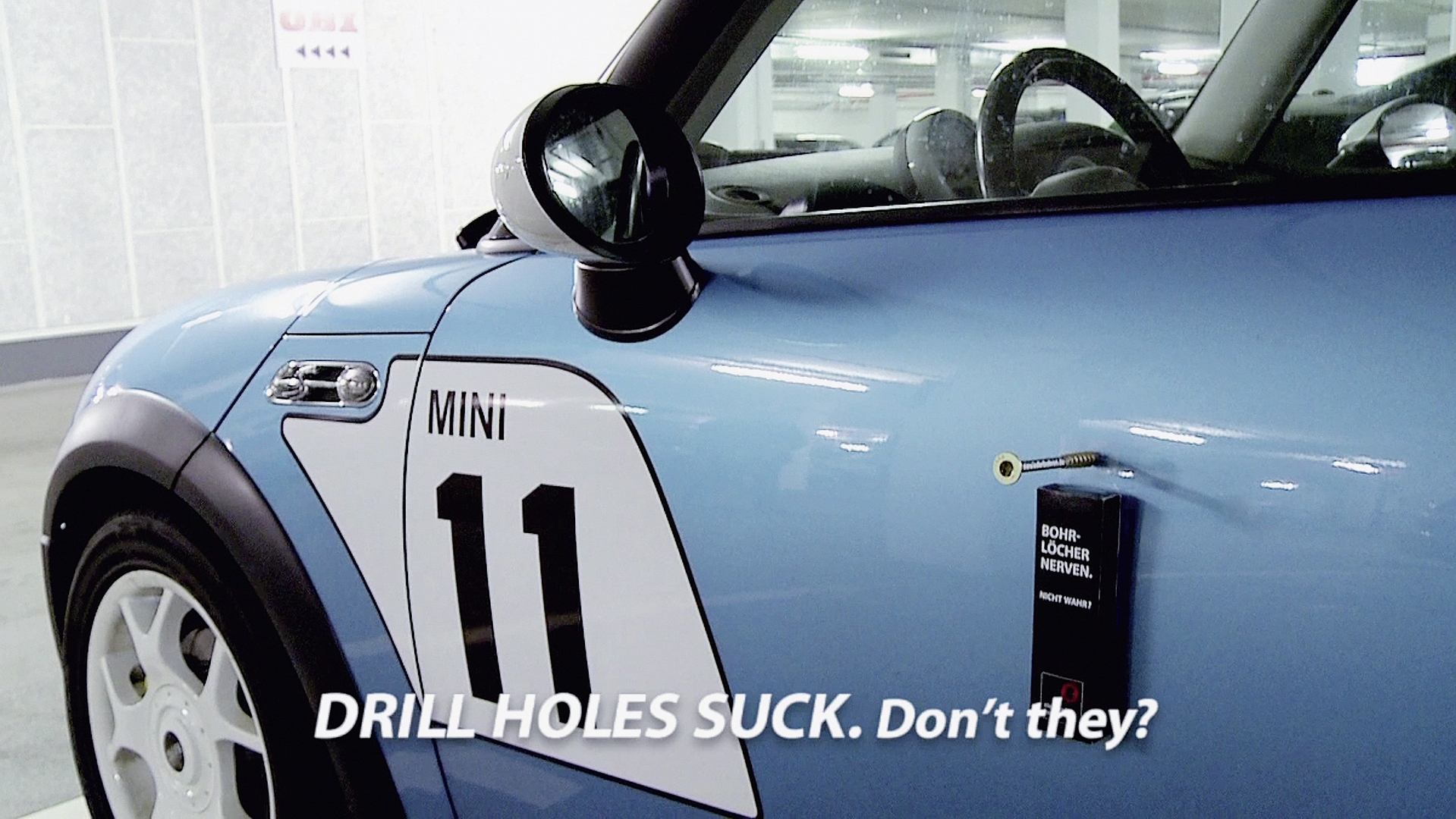 Driller Killer was a promotion campaign for the product “nie wieder bohren” (no more drilling), which makes drilling holes unnecessary. Without a media budget, the challenge was to find a simple idea to promote the product features in a tangible way, to enhance website traffic and to increase sales. Based on a bold and purposefully shocking concept, the campaign illustrated how drilling holes is annoying and how life is easier without it. The approach involved affixing product samples with screws to the doors of parked cars in the parking lots of hardware stores in Stuttgart, Dortmund, Munich and Frankfurt. Shocked at first, car owners soon relaxed again: the screws were magnetic and could easily be removed without leaving residue, just like the promoted product itself.