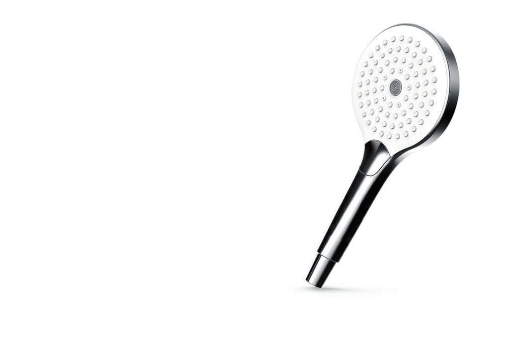 Eine prägnante Linienführung in Verbindung mit weichen Konturen modelliert das Erscheinungsbild der Handbrause E-Clean. Die Strahlfläche des Duschkopfs ist ganz in Weiß gehalten. Sie setzt einen optisch wirkungsvollen Akzent und harmoniert stilvoll mit dem silberglänzenden Griff. Ihre Düsen sind in konzentrischen Kreisen angeordnet. Dank ihres dezenten, zeitlosen Designs komplettiert E-Clean gekonnt Duschstangen und -systeme unterschiedlicher Gestaltung.