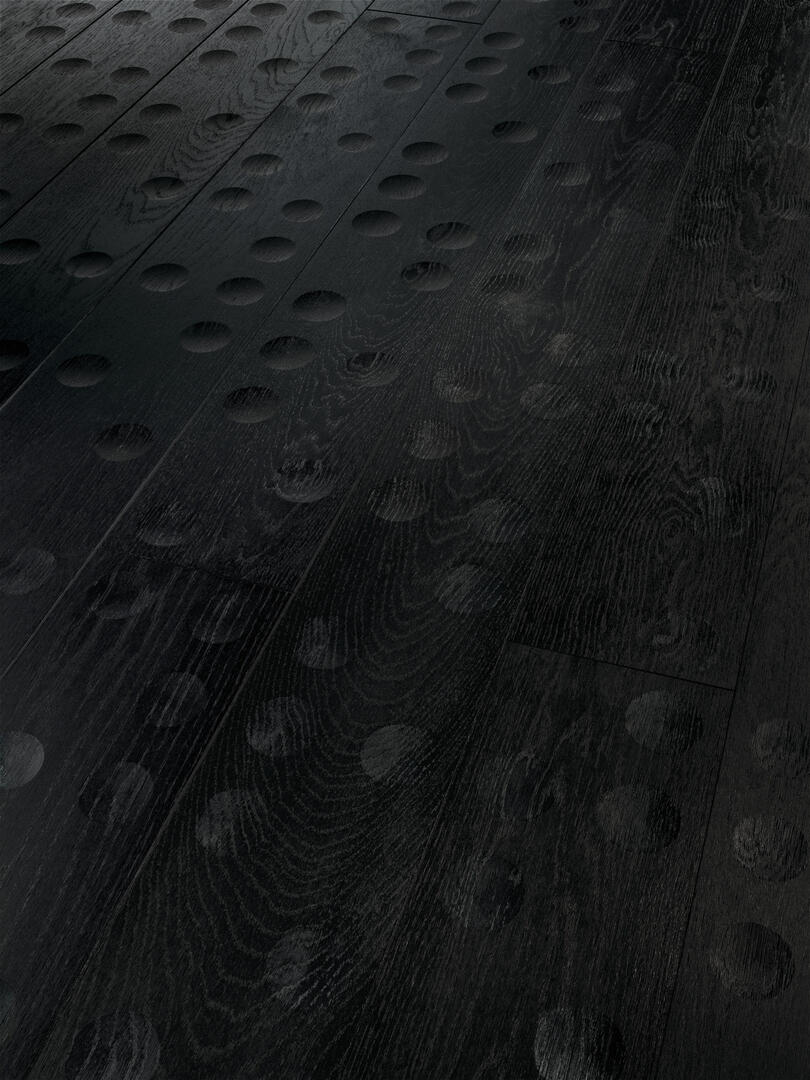 Robustes und elegantes Eichenholz bildet die Grundlage für den Boden NEA der Floor Fields Design Edition by Alfredo Häberli. Dieser Parkettboden punktet mit runden geometrischen Ausfräsungen in minimaler Tiefe. Reliefstrukturen und klare Konturen setzen Akzente und rufen individuelle Muster hervor. Je nach Lichteinfall entfaltet das Parkett die Wirkung im Raum auf unterschiedlichste Weise. Besonders elegant wirkt es mit seinen Unregelmäßigkeiten sowie den markanten und fein fühlbaren Mustern im schwarz gebeiztem Eichenholz.