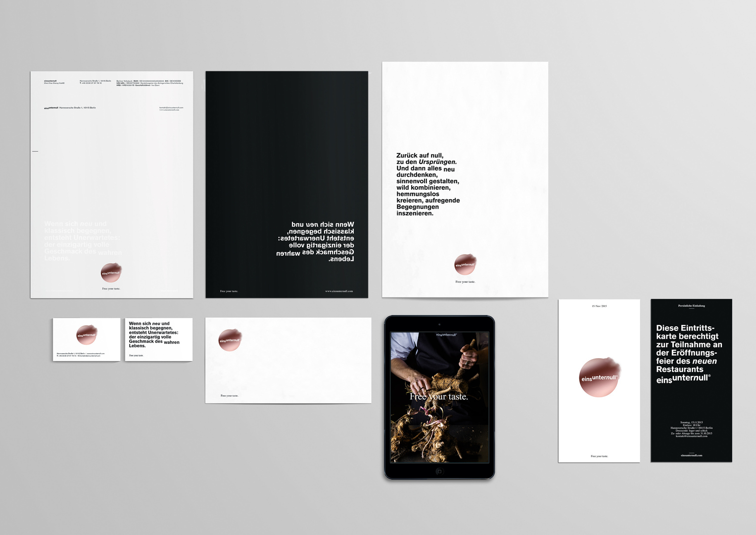 With the aim of developing a corporate design that breaks with the usual standards, a strikingly original visual appearance was created for the Berlin based underground restaurant “einsunternull”. In its minimalist and authentic form, the new look precisely conveys the culinary essence of the restaurant. Following this, the unusual imagery, design language and colour palette reflect the high-contrast world of Berlin gourmets. The slogan “Free your taste” sends a clear and unmistakeable message of a visionary cuisine. Furthermore, its appealing words have a fascinating quality.