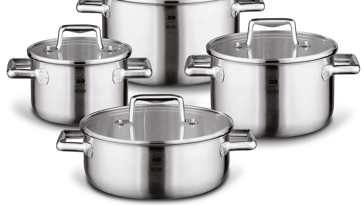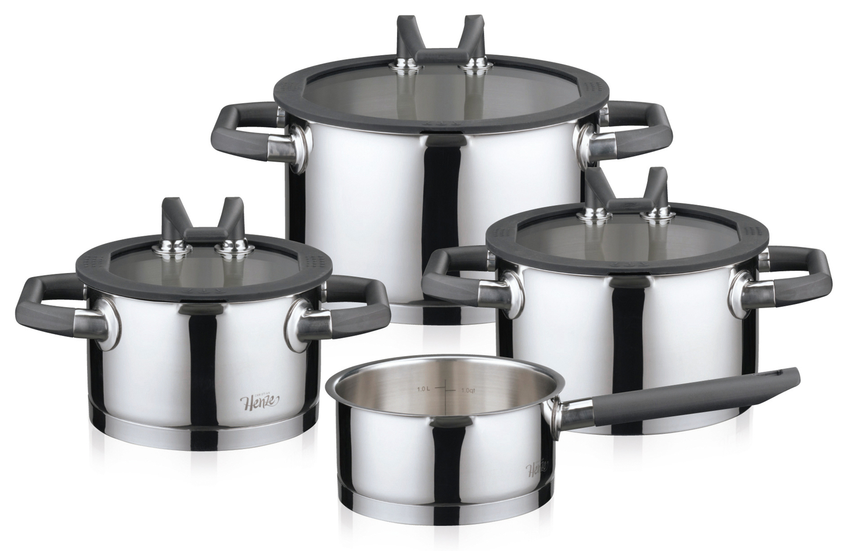 Die für alle Herdarten geeignete Topfserie Black Pearl aus hochglanzpoliertem Edelstahl wurde mit bruchsicheren Glasdeckeln sowie hitzebeständigen Kunststoffgriffen ausgestattet. Ihre patentierten Deckel mit neuartigem Handgriff können senkrecht aufgestellt werden. Eine Mulde im Silikonrand sammelt das Kondenswasser und hält somit die Arbeitsfläche trocken. Für eine gute Energieeffizienz sorgt der dicke Impact-Blockboden mit Energieleitrillen.