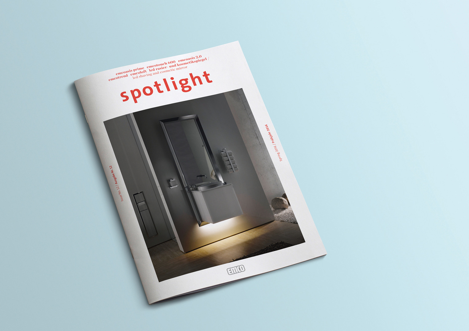 The magazine “emco Spotlight” visualises the design competence of the manufacturer and its ongoing search for improvement. It wants to make clear that the bathroom represents an individual place of peace. Presented in A3 format, it sets out to be more informative than a newsletter yet more appealing than a catalogue, highlighting the flexibility and future-oriented evolution of emco bathroom fittings. This is achieved by a clear layout that focuses on the product-design qualities.