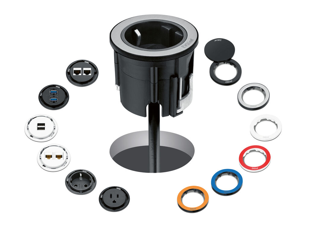 EVOline One bietet sowohl im Privatbereich als auch am Arbeitsplatz einen kompakten Strom- und Datenzugang. Die platzsparend gestaltete Steckdose kann horizontal oder vertikal in alle Plattenmaterialien und in mit Polstern bekleidete Möbel eingebaut werden. Ihr rundes Design ermöglicht eine schnelle Montage, für die lediglich ein Lochausschnitt von 54 mm Durchmesser nötig ist. Klemmstücke sorgen dabei für den sicheren Halt ab einer Plattenstärke von 9 mm. Dank vieler Moduleinsätze lässt sich die Steckdose unterschiedlichen Anforderungen anpassen.